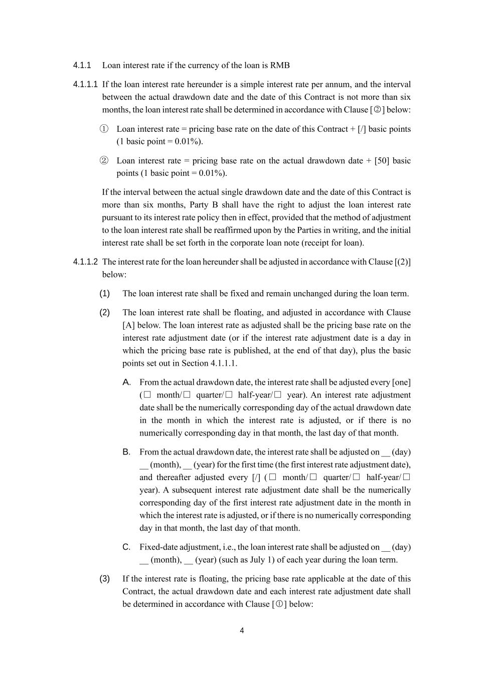 4 4.1.1 Loan interest rate if the currency of the loan is RMB 4.1.1.1 If the loan interest rate hereunder is a simple interest rate per annum, and the interval between the actual drawdown date and the date of this Contract is not more than six months, the loan interest rate shall be determined in accordance with Clause [○2 ] below: ① Loan interest rate = pricing base rate on the date of this Contract + [/] basic points (1 basic point = 0.01%). ② Loan interest rate = pricing base rate on the actual drawdown date + [50] basic points (1 basic point = 0.01%). If the interval between the actual single drawdown date and the date of this Contract is more than six months, Party B shall have the right to adjust the loan interest rate pursuant to its interest rate policy then in effect, provided that the method of adjustment to the loan interest rate shall be reaffirmed upon by the Parties in writing, and the initial interest rate shall be set forth in the corporate loan note (receipt for loan). 4.1.1.2 The interest rate for the loan hereunder shall be adjusted in accordance with Clause [(2)] below: (1) The loan interest rate shall be fixed and remain unchanged during the loan term. (2) The loan interest rate shall be floating, and adjusted in accordance with Clause [A] below. The loan interest rate as adjusted shall be the pricing base rate on the interest rate adjustment date (or if the interest rate adjustment date is a day in which the pricing base rate is published, at the end of that day), plus the basic points set out in Section 4.1.1.1. A. From the actual drawdown date, the interest rate shall be adjusted every [one] (□ month/□ quarter/□ half-year/□ year). An interest rate adjustment date shall be the numerically corresponding day of the actual drawdown date in the month in which the interest rate is adjusted, or if there is no numerically corresponding day in that month, the last day of that month. B. From the actual drawdown date, the interest rate shall be adjusted on __ (day) __ (month), __ (year) for the first time (the first interest rate adjustment date), and thereafter adjusted every [/] (□ month/□ quarter/□ half-year/□ year). A subsequent interest rate adjustment date shall be the numerically corresponding day of the first interest rate adjustment date in the month in which the interest rate is adjusted, or if there is no numerically corresponding day in that month, the last day of that month. C. Fixed-date adjustment, i.e., the loan interest rate shall be adjusted on __ (day) __ (month), __ (year) (such as July 1) of each year during the loan term. (3) If the interest rate is floating, the pricing base rate applicable at the date of this Contract, the actual drawdown date and each interest rate adjustment date shall be determined in accordance with Clause [○1 ] below: