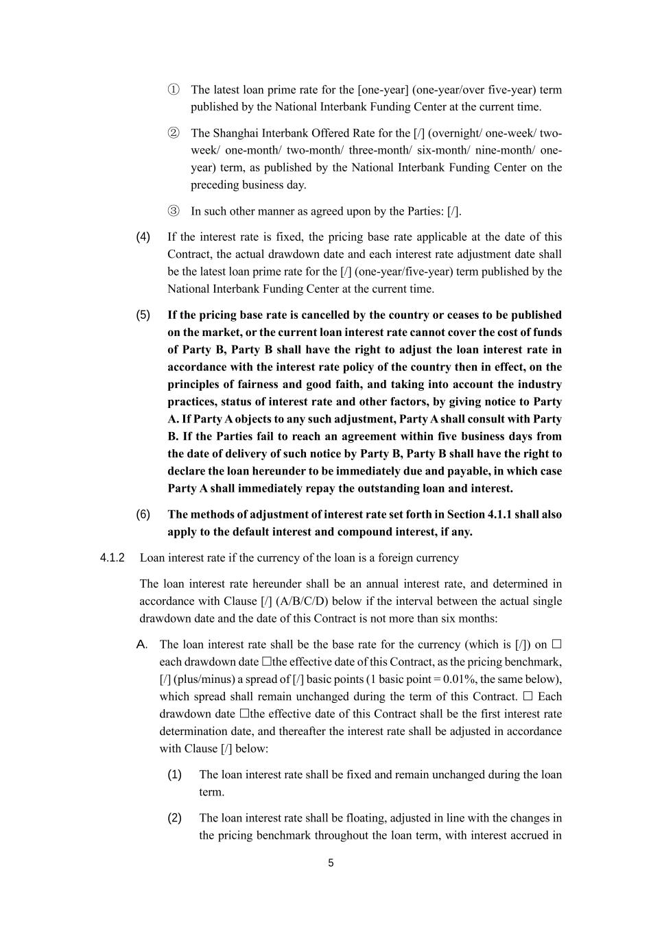 5 ① The latest loan prime rate for the [one-year] (one-year/over five-year) term published by the National Interbank Funding Center at the current time. ② The Shanghai Interbank Offered Rate for the [/] (overnight/ one-week/ two- week/ one-month/ two-month/ three-month/ six-month/ nine-month/ one- year) term, as published by the National Interbank Funding Center on the preceding business day. ③ In such other manner as agreed upon by the Parties: [/]. (4) If the interest rate is fixed, the pricing base rate applicable at the date of this Contract, the actual drawdown date and each interest rate adjustment date shall be the latest loan prime rate for the [/] (one-year/five-year) term published by the National Interbank Funding Center at the current time. (5) If the pricing base rate is cancelled by the country or ceases to be published on the market, or the current loan interest rate cannot cover the cost of funds of Party B, Party B shall have the right to adjust the loan interest rate in accordance with the interest rate policy of the country then in effect, on the principles of fairness and good faith, and taking into account the industry practices, status of interest rate and other factors, by giving notice to Party A. If Party A objects to any such adjustment, Party A shall consult with Party B. If the Parties fail to reach an agreement within five business days from the date of delivery of such notice by Party B, Party B shall have the right to declare the loan hereunder to be immediately due and payable, in which case Party A shall immediately repay the outstanding loan and interest. (6) The methods of adjustment of interest rate set forth in Section 4.1.1 shall also apply to the default interest and compound interest, if any. 4.1.2 Loan interest rate if the currency of the loan is a foreign currency The loan interest rate hereunder shall be an annual interest rate, and determined in accordance with Clause [/] (A/B/C/D) below if the interval between the actual single drawdown date and the date of this Contract is not more than six months: A. The loan interest rate shall be the base rate for the currency (which is [/]) on  each drawdown date the effective date of this Contract, as the pricing benchmark, [/] (plus/minus) a spread of [/] basic points (1 basic point = 0.01%, the same below), which spread shall remain unchanged during the term of this Contract.  Each drawdown date the effective date of this Contract shall be the first interest rate determination date, and thereafter the interest rate shall be adjusted in accordance with Clause [/] below: (1) The loan interest rate shall be fixed and remain unchanged during the loan term. (2) The loan interest rate shall be floating, adjusted in line with the changes in the pricing benchmark throughout the loan term, with interest accrued in