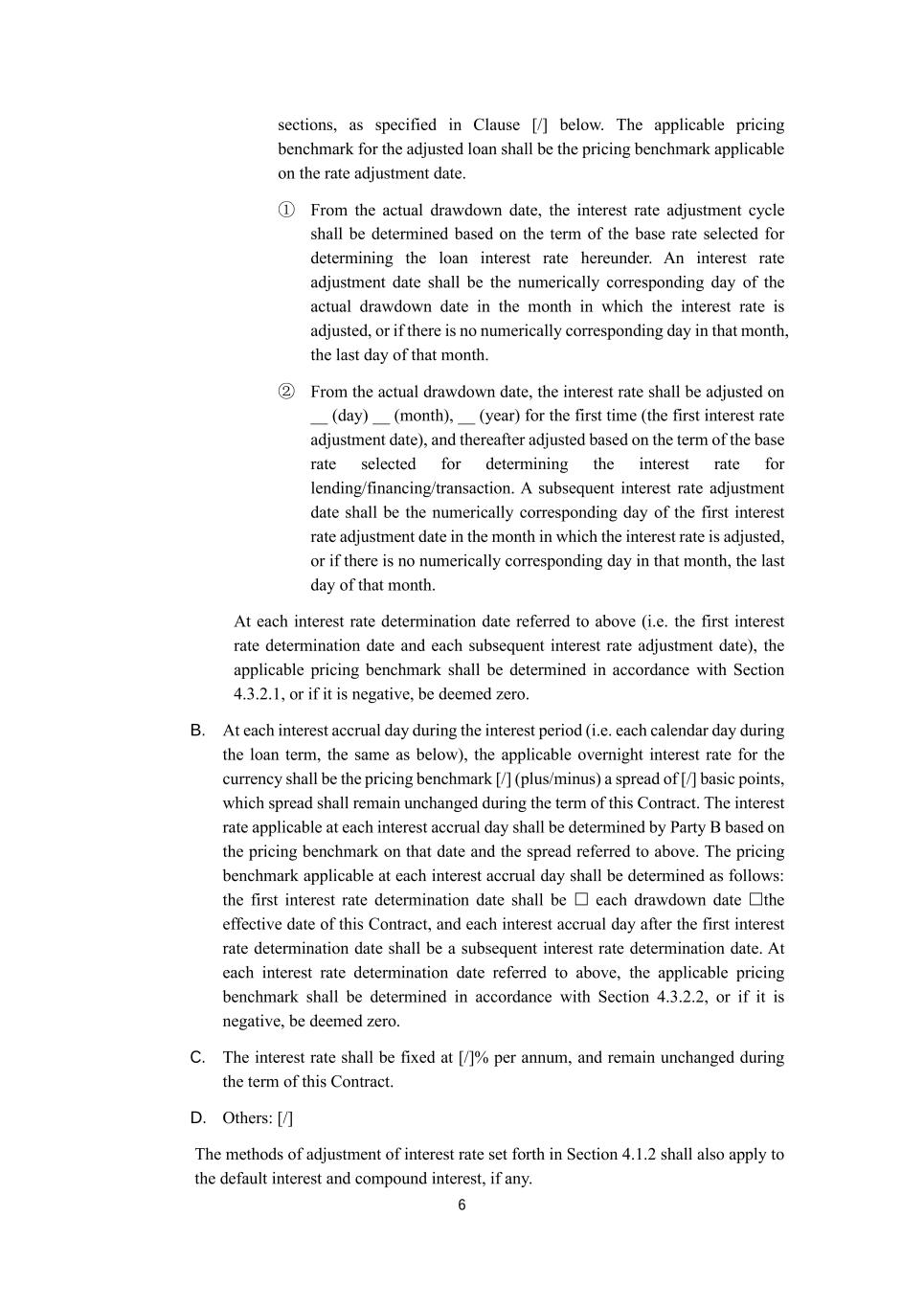 6 sections, as specified in Clause [/] below. The applicable pricing benchmark for the adjusted loan shall be the pricing benchmark applicable on the rate adjustment date. ① From the actual drawdown date, the interest rate adjustment cycle shall be determined based on the term of the base rate selected for determining the loan interest rate hereunder. An interest rate adjustment date shall be the numerically corresponding day of the actual drawdown date in the month in which the interest rate is adjusted, or if there is no numerically corresponding day in that month, the last day of that month. ② From the actual drawdown date, the interest rate shall be adjusted on __ (day) __ (month), __ (year) for the first time (the first interest rate adjustment date), and thereafter adjusted based on the term of the base rate selected for determining the interest rate for lending/financing/transaction. A subsequent interest rate adjustment date shall be the numerically corresponding day of the first interest rate adjustment date in the month in which the interest rate is adjusted, or if there is no numerically corresponding day in that month, the last day of that month. At each interest rate determination date referred to above (i.e. the first interest rate determination date and each subsequent interest rate adjustment date), the applicable pricing benchmark shall be determined in accordance with Section 4.3.2.1, or if it is negative, be deemed zero. B. At each interest accrual day during the interest period (i.e. each calendar day during the loan term, the same as below), the applicable overnight interest rate for the currency shall be the pricing benchmark [/] (plus/minus) a spread of [/] basic points, which spread shall remain unchanged during the term of this Contract. The interest rate applicable at each interest accrual day shall be determined by Party B based on the pricing benchmark on that date and the spread referred to above. The pricing benchmark applicable at each interest accrual day shall be determined as follows: the first interest rate determination date shall be  each drawdown date the effective date of this Contract, and each interest accrual day after the first interest rate determination date shall be a subsequent interest rate determination date. At each interest rate determination date referred to above, the applicable pricing benchmark shall be determined in accordance with Section 4.3.2.2, or if it is negative, be deemed zero. C. The interest rate shall be fixed at [/]% per annum, and remain unchanged during the term of this Contract. D. Others: [/] The methods of adjustment of interest rate set forth in Section 4.1.2 shall also apply to the default interest and compound interest, if any.