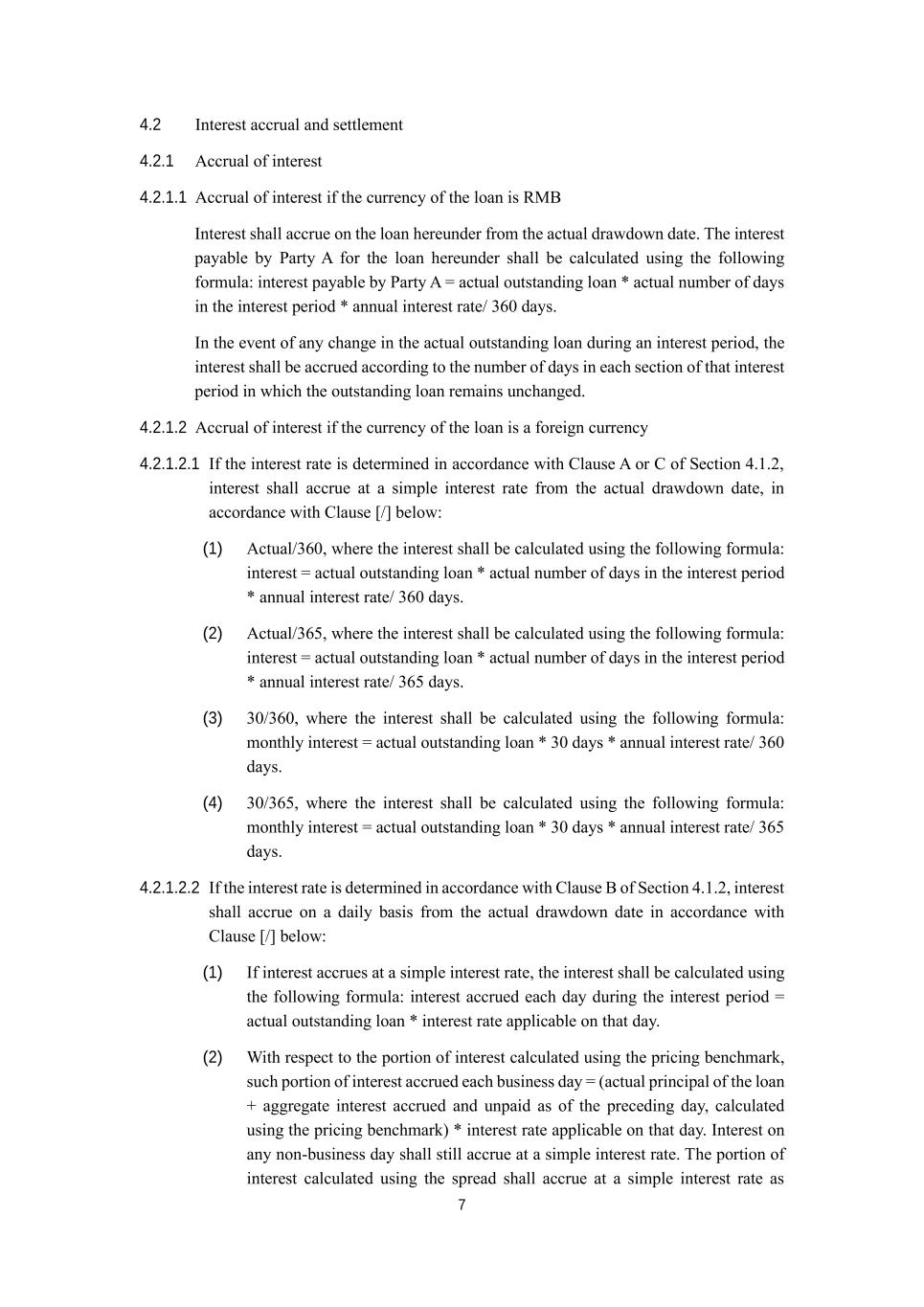 7 4.2 Interest accrual and settlement 4.2.1 Accrual of interest 4.2.1.1 Accrual of interest if the currency of the loan is RMB Interest shall accrue on the loan hereunder from the actual drawdown date. The interest payable by Party A for the loan hereunder shall be calculated using the following formula: interest payable by Party A = actual outstanding loan * actual number of days in the interest period * annual interest rate/ 360 days. In the event of any change in the actual outstanding loan during an interest period, the interest shall be accrued according to the number of days in each section of that interest period in which the outstanding loan remains unchanged. 4.2.1.2 Accrual of interest if the currency of the loan is a foreign currency 4.2.1.2.1 If the interest rate is determined in accordance with Clause A or C of Section 4.1.2, interest shall accrue at a simple interest rate from the actual drawdown date, in accordance with Clause [/] below: (1) Actual/360, where the interest shall be calculated using the following formula: interest = actual outstanding loan * actual number of days in the interest period * annual interest rate/ 360 days. (2) Actual/365, where the interest shall be calculated using the following formula: interest = actual outstanding loan * actual number of days in the interest period * annual interest rate/ 365 days. (3) 30/360, where the interest shall be calculated using the following formula: monthly interest = actual outstanding loan * 30 days * annual interest rate/ 360 days. (4) 30/365, where the interest shall be calculated using the following formula: monthly interest = actual outstanding loan * 30 days * annual interest rate/ 365 days. 4.2.1.2.2 If the interest rate is determined in accordance with Clause B of Section 4.1.2, interest shall accrue on a daily basis from the actual drawdown date in accordance with Clause [/] below: (1) If interest accrues at a simple interest rate, the interest shall be calculated using the following formula: interest accrued each day during the interest period = actual outstanding loan * interest rate applicable on that day. (2) With respect to the portion of interest calculated using the pricing benchmark, such portion of interest accrued each business day = (actual principal of the loan + aggregate interest accrued and unpaid as of the preceding day, calculated using the pricing benchmark) * interest rate applicable on that day. Interest on any non-business day shall still accrue at a simple interest rate. The portion of interest calculated using the spread shall accrue at a simple interest rate as