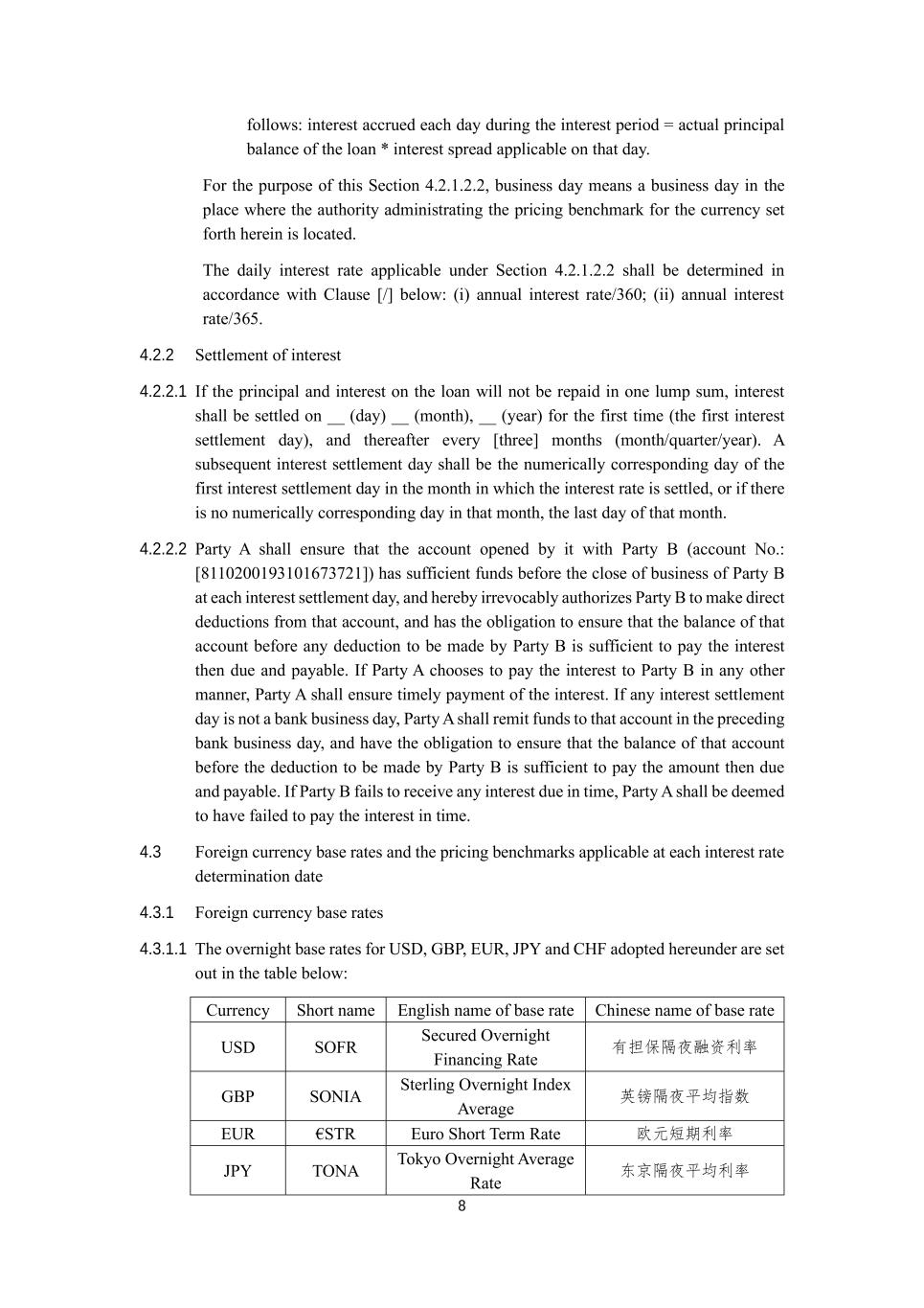 8 follows: interest accrued each day during the interest period = actual principal balance of the loan * interest spread applicable on that day. For the purpose of this Section 4.2.1.2.2, business day means a business day in the place where the authority administrating the pricing benchmark for the currency set forth herein is located. The daily interest rate applicable under Section 4.2.1.2.2 shall be determined in accordance with Clause [/] below: (i) annual interest rate/360; (ii) annual interest rate/365. 4.2.2 Settlement of interest 4.2.2.1 If the principal and interest on the loan will not be repaid in one lump sum, interest shall be settled on __ (day) __ (month), __ (year) for the first time (the first interest settlement day), and thereafter every [three] months (month/quarter/year). A subsequent interest settlement day shall be the numerically corresponding day of the first interest settlement day in the month in which the interest rate is settled, or if there is no numerically corresponding day in that month, the last day of that month. 4.2.2.2 Party A shall ensure that the account opened by it with Party B (account No.: [8110200193101673721]) has sufficient funds before the close of business of Party B at each interest settlement day, and hereby irrevocably authorizes Party B to make direct deductions from that account, and has the obligation to ensure that the balance of that account before any deduction to be made by Party B is sufficient to pay the interest then due and payable. If Party A chooses to pay the interest to Party B in any other manner, Party A shall ensure timely payment of the interest. If any interest settlement day is not a bank business day, Party A shall remit funds to that account in the preceding bank business day, and have the obligation to ensure that the balance of that account before the deduction to be made by Party B is sufficient to pay the amount then due and payable. If Party B fails to receive any interest due in time, Party A shall be deemed to have failed to pay the interest in time. 4.3 Foreign currency base rates and the pricing benchmarks applicable at each interest rate determination date 4.3.1 Foreign currency base rates 4.3.1.1 The overnight base rates for USD, GBP, EUR, JPY and CHF adopted hereunder are set out in the table below: Currency Short name English name of base rate Chinese name of base rate USD SOFR Secured Overnight Financing Rate 有担保隔夜融资利率 GBP SONIA Sterling Overnight Index Average 英镑隔夜平均指数 EUR €STR Euro Short Term Rate 欧元短期利率 JPY TONA Tokyo Overnight Average Rate 东京隔夜平均利率