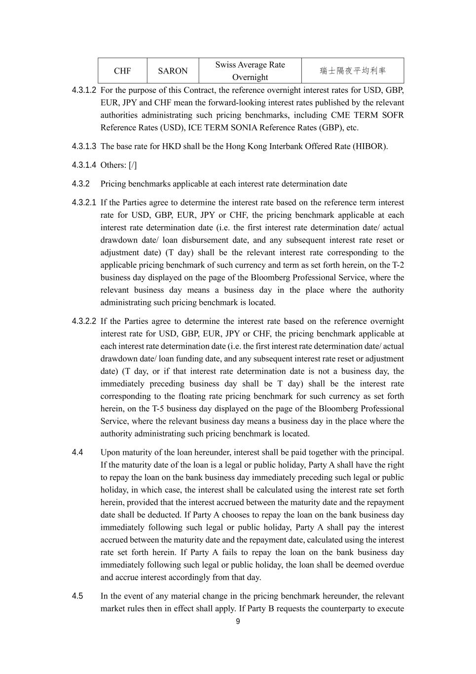 9 CHF SARON Swiss Average Rate Overnight 瑞士隔夜平均利率 4.3.1.2 For the purpose of this Contract, the reference overnight interest rates for USD, GBP, EUR, JPY and CHF mean the forward-looking interest rates published by the relevant authorities administrating such pricing benchmarks, including CME TERM SOFR Reference Rates (USD), ICE TERM SONIA Reference Rates (GBP), etc. 4.3.1.3 The base rate for HKD shall be the Hong Kong Interbank Offered Rate (HIBOR). 4.3.1.4 Others: [/] 4.3.2 Pricing benchmarks applicable at each interest rate determination date 4.3.2.1 If the Parties agree to determine the interest rate based on the reference term interest rate for USD, GBP, EUR, JPY or CHF, the pricing benchmark applicable at each interest rate determination date (i.e. the first interest rate determination date/ actual drawdown date/ loan disbursement date, and any subsequent interest rate reset or adjustment date) (T day) shall be the relevant interest rate corresponding to the applicable pricing benchmark of such currency and term as set forth herein, on the T-2 business day displayed on the page of the Bloomberg Professional Service, where the relevant business day means a business day in the place where the authority administrating such pricing benchmark is located. 4.3.2.2 If the Parties agree to determine the interest rate based on the reference overnight interest rate for USD, GBP, EUR, JPY or CHF, the pricing benchmark applicable at each interest rate determination date (i.e. the first interest rate determination date/ actual drawdown date/ loan funding date, and any subsequent interest rate reset or adjustment date) (T day, or if that interest rate determination date is not a business day, the immediately preceding business day shall be T day) shall be the interest rate corresponding to the floating rate pricing benchmark for such currency as set forth herein, on the T-5 business day displayed on the page of the Bloomberg Professional Service, where the relevant business day means a business day in the place where the authority administrating such pricing benchmark is located. 4.4 Upon maturity of the loan hereunder, interest shall be paid together with the principal. If the maturity date of the loan is a legal or public holiday, Party A shall have the right to repay the loan on the bank business day immediately preceding such legal or public holiday, in which case, the interest shall be calculated using the interest rate set forth herein, provided that the interest accrued between the maturity date and the repayment date shall be deducted. If Party A chooses to repay the loan on the bank business day immediately following such legal or public holiday, Party A shall pay the interest accrued between the maturity date and the repayment date, calculated using the interest rate set forth herein. If Party A fails to repay the loan on the bank business day immediately following such legal or public holiday, the loan shall be deemed overdue and accrue interest accordingly from that day. 4.5 In the event of any material change in the pricing benchmark hereunder, the relevant market rules then in effect shall apply. If Party B requests the counterparty to execute