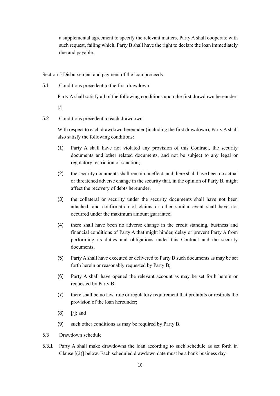 10 a supplemental agreement to specify the relevant matters, Party A shall cooperate with such request, failing which, Party B shall have the right to declare the loan immediately due and payable. Section 5 Disbursement and payment of the loan proceeds 5.1 Conditions precedent to the first drawdown Party A shall satisfy all of the following conditions upon the first drawdown hereunder: [/] 5.2 Conditions precedent to each drawdown With respect to each drawdown hereunder (including the first drawdown), Party A shall also satisfy the following conditions: (1) Party A shall have not violated any provision of this Contract, the security documents and other related documents, and not be subject to any legal or regulatory restriction or sanction; (2) the security documents shall remain in effect, and there shall have been no actual or threatened adverse change in the security that, in the opinion of Party B, might affect the recovery of debts hereunder; (3) the collateral or security under the security documents shall have not been attached, and confirmation of claims or other similar event shall have not occurred under the maximum amount guarantee; (4) there shall have been no adverse change in the credit standing, business and financial conditions of Party A that might hinder, delay or prevent Party A from performing its duties and obligations under this Contract and the security documents; (5) Party A shall have executed or delivered to Party B such documents as may be set forth herein or reasonably requested by Party B; (6) Party A shall have opened the relevant account as may be set forth herein or requested by Party B; (7) there shall be no law, rule or regulatory requirement that prohibits or restricts the provision of the loan hereunder; (8) [/]; and (9) such other conditions as may be required by Party B. 5.3 Drawdown schedule 5.3.1 Party A shall make drawdowns the loan according to such schedule as set forth in Clause [(2)] below. Each scheduled drawdown date must be a bank business day.
