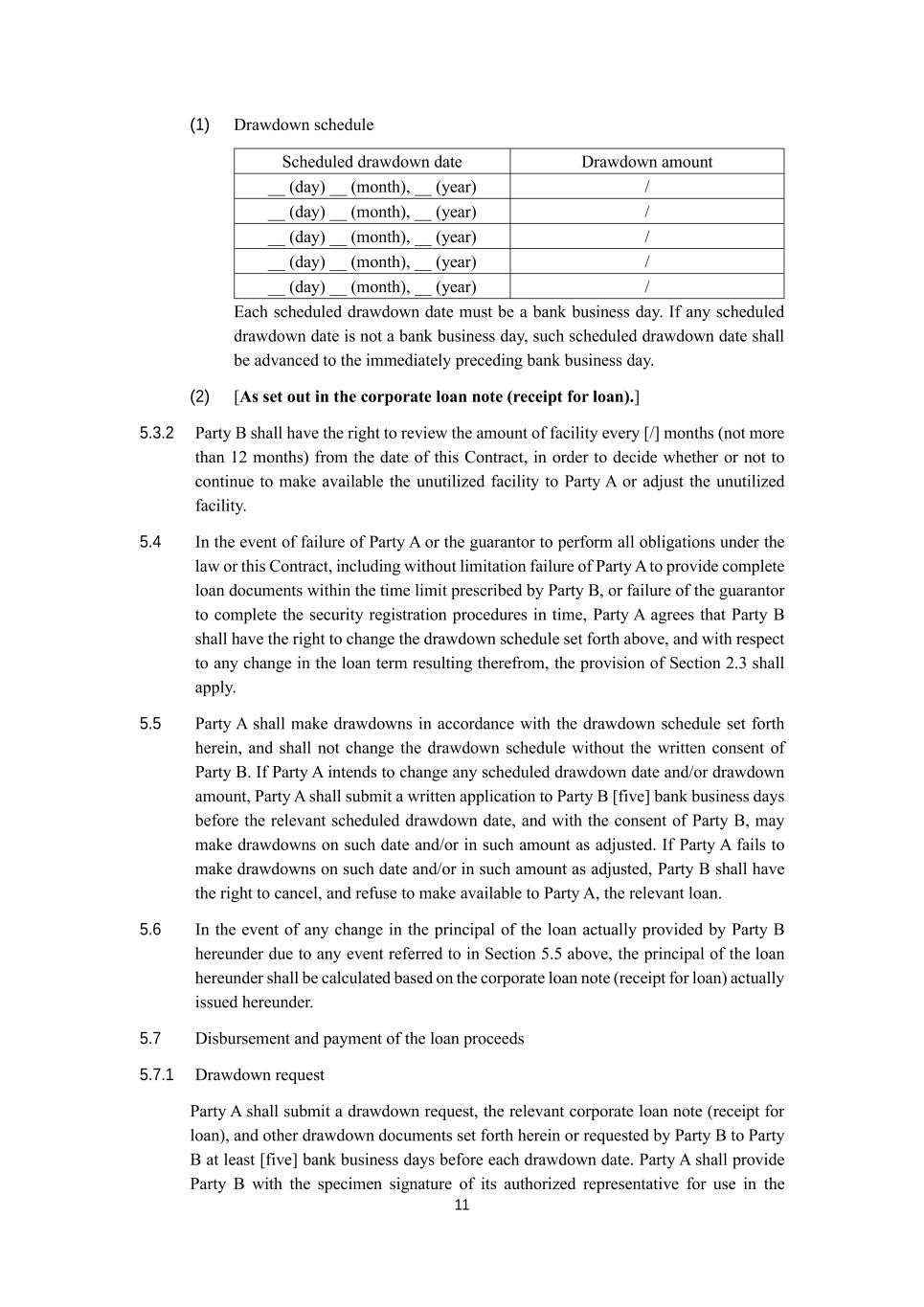 11 (1) Drawdown schedule Scheduled drawdown date Drawdown amount __ (day) __ (month), __ (year) / __ (day) __ (month), __ (year) / __ (day) __ (month), __ (year) / __ (day) __ (month), __ (year) / __ (day) __ (month), __ (year) / Each scheduled drawdown date must be a bank business day. If any scheduled drawdown date is not a bank business day, such scheduled drawdown date shall be advanced to the immediately preceding bank business day. (2) [As set out in the corporate loan note (receipt for loan).] 5.3.2 Party B shall have the right to review the amount of facility every [/] months (not more than 12 months) from the date of this Contract, in order to decide whether or not to continue to make available the unutilized facility to Party A or adjust the unutilized facility. 5.4 In the event of failure of Party A or the guarantor to perform all obligations under the law or this Contract, including without limitation failure of Party A to provide complete loan documents within the time limit prescribed by Party B, or failure of the guarantor to complete the security registration procedures in time, Party A agrees that Party B shall have the right to change the drawdown schedule set forth above, and with respect to any change in the loan term resulting therefrom, the provision of Section 2.3 shall apply. 5.5 Party A shall make drawdowns in accordance with the drawdown schedule set forth herein, and shall not change the drawdown schedule without the written consent of Party B. If Party A intends to change any scheduled drawdown date and/or drawdown amount, Party A shall submit a written application to Party B [five] bank business days before the relevant scheduled drawdown date, and with the consent of Party B, may make drawdowns on such date and/or in such amount as adjusted. If Party A fails to make drawdowns on such date and/or in such amount as adjusted, Party B shall have the right to cancel, and refuse to make available to Party A, the relevant loan. 5.6 In the event of any change in the principal of the loan actually provided by Party B hereunder due to any event referred to in Section 5.5 above, the principal of the loan hereunder shall be calculated based on the corporate loan note (receipt for loan) actually issued hereunder. 5.7 Disbursement and payment of the loan proceeds 5.7.1 Drawdown request Party A shall submit a drawdown request, the relevant corporate loan note (receipt for loan), and other drawdown documents set forth herein or requested by Party B to Party B at least [five] bank business days before each drawdown date. Party A shall provide Party B with the specimen signature of its authorized representative for use in the