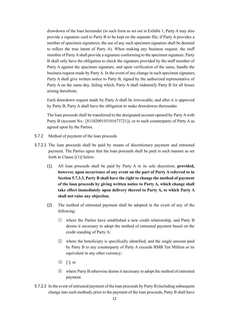 12 drawdown of the loan hereunder (in such form as set out in Exhibit 1; Party A may also provide a signature card to Party B to be kept on the separate file; if Party A provides a number of specimen signatures, the use of any such specimen signature shall be deemed to reflect the true intent of Party A). When making any business request, the staff member of Party A shall provide a signature conforming to the specimen signature. Party B shall only have the obligation to check the signature provided by the staff member of Party A against the specimen signature, and upon verification of the same, handle the business request made by Party A. In the event of any change in such specimen signature, Party A shall give written notice to Party B, signed by the authorized representative of Party A on the same day, failing which, Party A shall indemnify Party B for all losses arising therefrom. Each drawdown request made by Party A shall be irrevocable, and after it is approved by Party B, Party A shall have the obligation to make drawdowns thereunder. The loan proceeds shall be transferred to the designated account opened by Party A with Party B (account No.: [8110200193101673721]), or to such counterparty of Party A as agreed upon by the Parties. 5.7.2 Method of payment of the loan proceeds 5.7.2.1 The loan proceeds shall be paid by means of discretionary payment and entrusted payment. The Parties agree that the loan proceeds shall be paid in such manner as set forth in Clause [(1)] below: (1) All loan proceeds shall be paid by Party A in its sole discretion; provided, however, upon occurrence of any event on the part of Party A referred to in Section 5.7.3.3, Party B shall have the right to change the method of payment of the loan proceeds by giving written notice to Party A, which change shall take effect immediately upon delivery thereof to Party A, to which Party A shall not raise any objection. (2) The method of entrusted payment shall be adopted in the event of any of the following: ① where the Parties have established a new credit relationship, and Party B deems it necessary to adopt the method of entrusted payment based on the credit standing of Party A; ② where the beneficiary is specifically identified, and the single amount paid by Party B to any counterparty of Party A exceeds RMB Ten Million or its equivalent in any other currency; ③ [/]; or ④ where Party B otherwise deems it necessary to adopt the method of entrusted payment. 5.7.2.2 In the event of entrusted payment of the loan proceeds by Party B (including subsequent change into such method), prior to the payment of the loan proceeds, Party B shall have