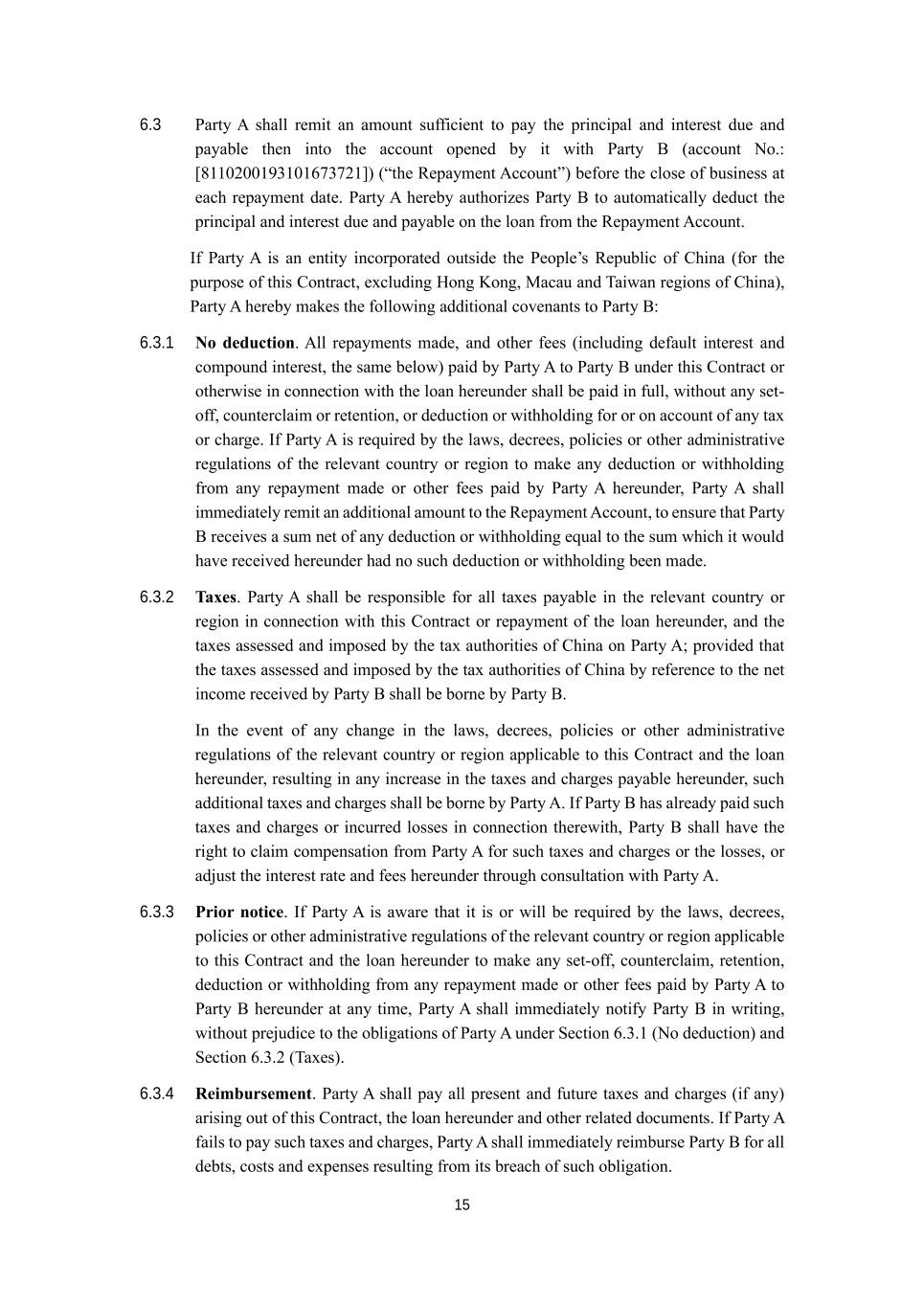 15 6.3 Party A shall remit an amount sufficient to pay the principal and interest due and payable then into the account opened by it with Party B (account No.: [8110200193101673721]) (“the Repayment Account”) before the close of business at each repayment date. Party A hereby authorizes Party B to automatically deduct the principal and interest due and payable on the loan from the Repayment Account. If Party A is an entity incorporated outside the People’s Republic of China (for the purpose of this Contract, excluding Hong Kong, Macau and Taiwan regions of China), Party A hereby makes the following additional covenants to Party B: 6.3.1 No deduction. All repayments made, and other fees (including default interest and compound interest, the same below) paid by Party A to Party B under this Contract or otherwise in connection with the loan hereunder shall be paid in full, without any set- off, counterclaim or retention, or deduction or withholding for or on account of any tax or charge. If Party A is required by the laws, decrees, policies or other administrative regulations of the relevant country or region to make any deduction or withholding from any repayment made or other fees paid by Party A hereunder, Party A shall immediately remit an additional amount to the Repayment Account, to ensure that Party B receives a sum net of any deduction or withholding equal to the sum which it would have received hereunder had no such deduction or withholding been made. 6.3.2 Taxes. Party A shall be responsible for all taxes payable in the relevant country or region in connection with this Contract or repayment of the loan hereunder, and the taxes assessed and imposed by the tax authorities of China on Party A; provided that the taxes assessed and imposed by the tax authorities of China by reference to the net income received by Party B shall be borne by Party B. In the event of any change in the laws, decrees, policies or other administrative regulations of the relevant country or region applicable to this Contract and the loan hereunder, resulting in any increase in the taxes and charges payable hereunder, such additional taxes and charges shall be borne by Party A. If Party B has already paid such taxes and charges or incurred losses in connection therewith, Party B shall have the right to claim compensation from Party A for such taxes and charges or the losses, or adjust the interest rate and fees hereunder through consultation with Party A. 6.3.3 Prior notice. If Party A is aware that it is or will be required by the laws, decrees, policies or other administrative regulations of the relevant country or region applicable to this Contract and the loan hereunder to make any set-off, counterclaim, retention, deduction or withholding from any repayment made or other fees paid by Party A to Party B hereunder at any time, Party A shall immediately notify Party B in writing, without prejudice to the obligations of Party A under Section 6.3.1 (No deduction) and Section 6.3.2 (Taxes). 6.3.4 Reimbursement. Party A shall pay all present and future taxes and charges (if any) arising out of this Contract, the loan hereunder and other related documents. If Party A fails to pay such taxes and charges, Party A shall immediately reimburse Party B for all debts, costs and expenses resulting from its breach of such obligation.
