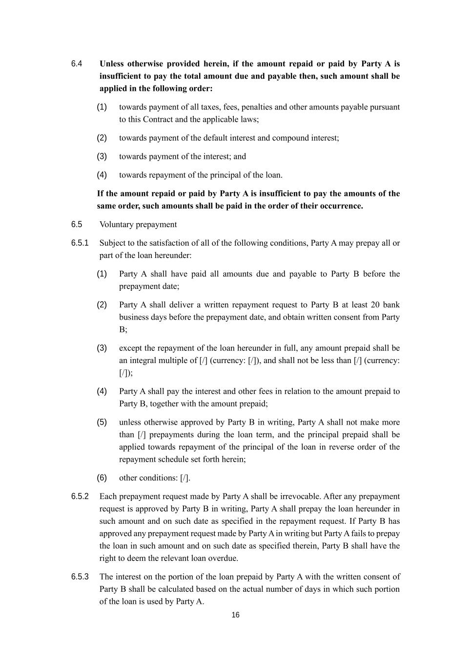 16 6.4 Unless otherwise provided herein, if the amount repaid or paid by Party A is insufficient to pay the total amount due and payable then, such amount shall be applied in the following order: (1) towards payment of all taxes, fees, penalties and other amounts payable pursuant to this Contract and the applicable laws; (2) towards payment of the default interest and compound interest; (3) towards payment of the interest; and (4) towards repayment of the principal of the loan. If the amount repaid or paid by Party A is insufficient to pay the amounts of the same order, such amounts shall be paid in the order of their occurrence. 6.5 Voluntary prepayment 6.5.1 Subject to the satisfaction of all of the following conditions, Party A may prepay all or part of the loan hereunder: (1) Party A shall have paid all amounts due and payable to Party B before the prepayment date; (2) Party A shall deliver a written repayment request to Party B at least 20 bank business days before the prepayment date, and obtain written consent from Party B; (3) except the repayment of the loan hereunder in full, any amount prepaid shall be an integral multiple of [/] (currency: [/]), and shall not be less than [/] (currency: [/]); (4) Party A shall pay the interest and other fees in relation to the amount prepaid to Party B, together with the amount prepaid; (5) unless otherwise approved by Party B in writing, Party A shall not make more than [/] prepayments during the loan term, and the principal prepaid shall be applied towards repayment of the principal of the loan in reverse order of the repayment schedule set forth herein; (6) other conditions: [/]. 6.5.2 Each prepayment request made by Party A shall be irrevocable. After any prepayment request is approved by Party B in writing, Party A shall prepay the loan hereunder in such amount and on such date as specified in the repayment request. If Party B has approved any prepayment request made by Party A in writing but Party A fails to prepay the loan in such amount and on such date as specified therein, Party B shall have the right to deem the relevant loan overdue. 6.5.3 The interest on the portion of the loan prepaid by Party A with the written consent of Party B shall be calculated based on the actual number of days in which such portion of the loan is used by Party A.