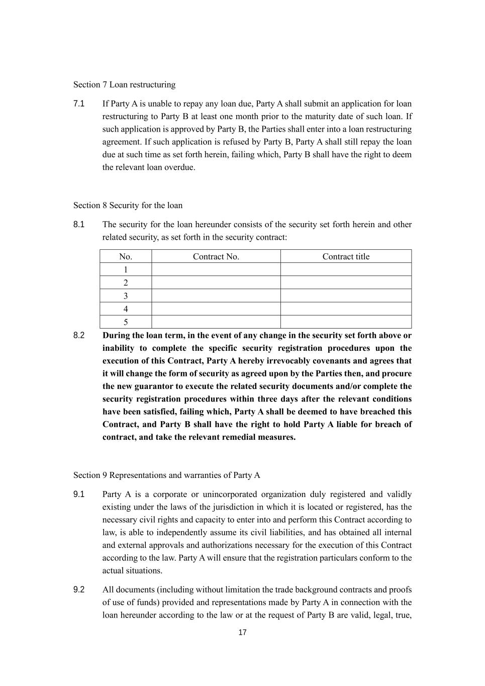 17 Section 7 Loan restructuring 7.1 If Party A is unable to repay any loan due, Party A shall submit an application for loan restructuring to Party B at least one month prior to the maturity date of such loan. If such application is approved by Party B, the Parties shall enter into a loan restructuring agreement. If such application is refused by Party B, Party A shall still repay the loan due at such time as set forth herein, failing which, Party B shall have the right to deem the relevant loan overdue. Section 8 Security for the loan 8.1 The security for the loan hereunder consists of the security set forth herein and other related security, as set forth in the security contract: No. Contract No. Contract title 1 2 3 4 5 8.2 During the loan term, in the event of any change in the security set forth above or inability to complete the specific security registration procedures upon the execution of this Contract, Party A hereby irrevocably covenants and agrees that it will change the form of security as agreed upon by the Parties then, and procure the new guarantor to execute the related security documents and/or complete the security registration procedures within three days after the relevant conditions have been satisfied, failing which, Party A shall be deemed to have breached this Contract, and Party B shall have the right to hold Party A liable for breach of contract, and take the relevant remedial measures. Section 9 Representations and warranties of Party A 9.1 Party A is a corporate or unincorporated organization duly registered and validly existing under the laws of the jurisdiction in which it is located or registered, has the necessary civil rights and capacity to enter into and perform this Contract according to law, is able to independently assume its civil liabilities, and has obtained all internal and external approvals and authorizations necessary for the execution of this Contract according to the law. Party A will ensure that the registration particulars conform to the actual situations. 9.2 All documents (including without limitation the trade background contracts and proofs of use of funds) provided and representations made by Party A in connection with the loan hereunder according to the law or at the request of Party B are valid, legal, true,