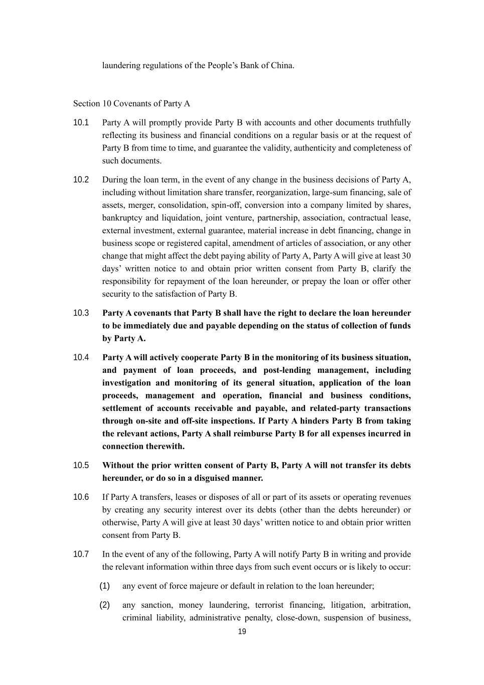 19 laundering regulations of the People’s Bank of China. Section 10 Covenants of Party A 10.1 Party A will promptly provide Party B with accounts and other documents truthfully reflecting its business and financial conditions on a regular basis or at the request of Party B from time to time, and guarantee the validity, authenticity and completeness of such documents. 10.2 During the loan term, in the event of any change in the business decisions of Party A, including without limitation share transfer, reorganization, large-sum financing, sale of assets, merger, consolidation, spin-off, conversion into a company limited by shares, bankruptcy and liquidation, joint venture, partnership, association, contractual lease, external investment, external guarantee, material increase in debt financing, change in business scope or registered capital, amendment of articles of association, or any other change that might affect the debt paying ability of Party A, Party A will give at least 30 days’ written notice to and obtain prior written consent from Party B, clarify the responsibility for repayment of the loan hereunder, or prepay the loan or offer other security to the satisfaction of Party B. 10.3 Party A covenants that Party B shall have the right to declare the loan hereunder to be immediately due and payable depending on the status of collection of funds by Party A. 10.4 Party A will actively cooperate Party B in the monitoring of its business situation, and payment of loan proceeds, and post-lending management, including investigation and monitoring of its general situation, application of the loan proceeds, management and operation, financial and business conditions, settlement of accounts receivable and payable, and related-party transactions through on-site and off-site inspections. If Party A hinders Party B from taking the relevant actions, Party A shall reimburse Party B for all expenses incurred in connection therewith. 10.5 Without the prior written consent of Party B, Party A will not transfer its debts hereunder, or do so in a disguised manner. 10.6 If Party A transfers, leases or disposes of all or part of its assets or operating revenues by creating any security interest over its debts (other than the debts hereunder) or otherwise, Party A will give at least 30 days’ written notice to and obtain prior written consent from Party B. 10.7 In the event of any of the following, Party A will notify Party B in writing and provide the relevant information within three days from such event occurs or is likely to occur: (1) any event of force majeure or default in relation to the loan hereunder; (2) any sanction, money laundering, terrorist financing, litigation, arbitration, criminal liability, administrative penalty, close-down, suspension of business,