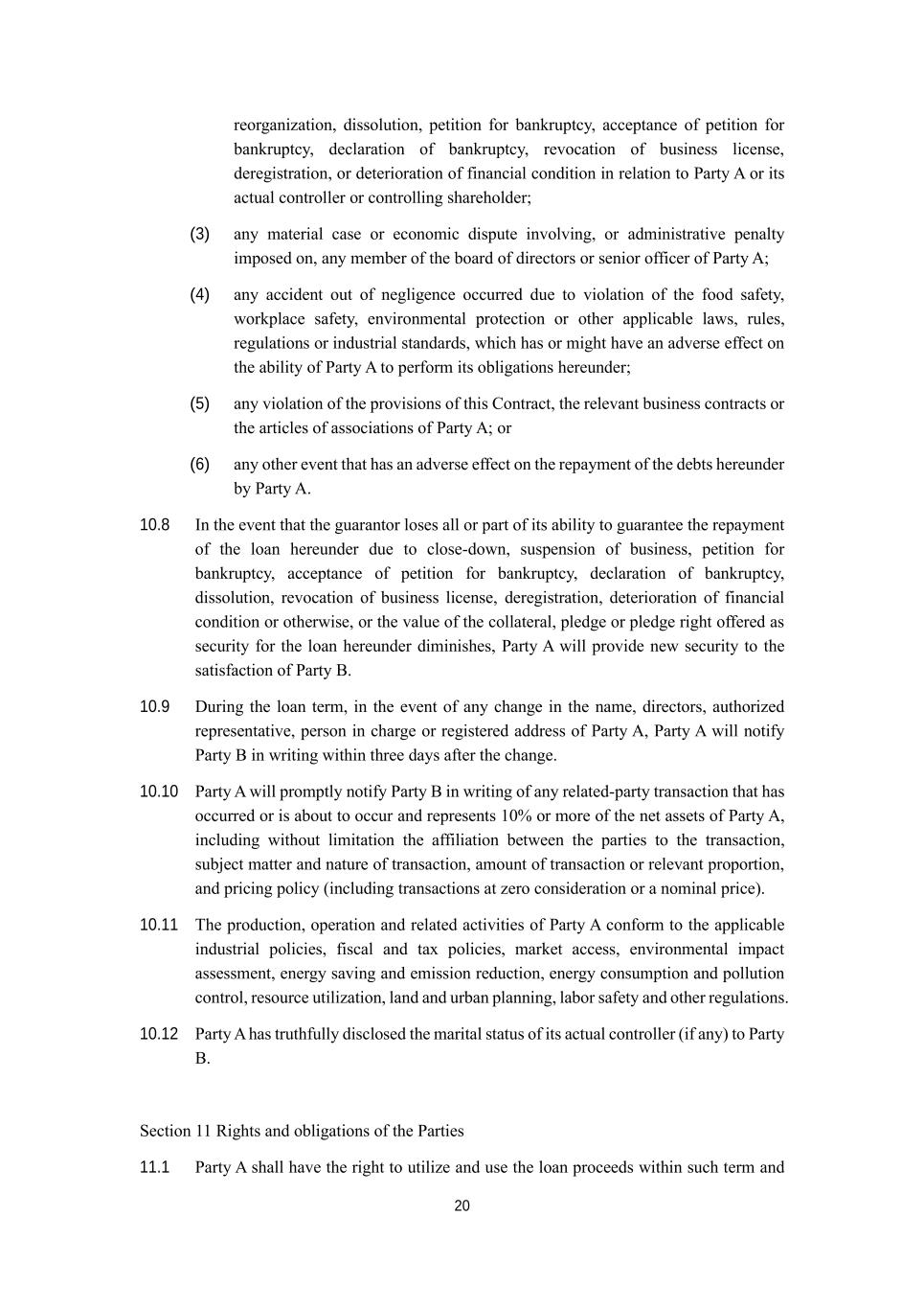 20 reorganization, dissolution, petition for bankruptcy, acceptance of petition for bankruptcy, declaration of bankruptcy, revocation of business license, deregistration, or deterioration of financial condition in relation to Party A or its actual controller or controlling shareholder; (3) any material case or economic dispute involving, or administrative penalty imposed on, any member of the board of directors or senior officer of Party A; (4) any accident out of negligence occurred due to violation of the food safety, workplace safety, environmental protection or other applicable laws, rules, regulations or industrial standards, which has or might have an adverse effect on the ability of Party A to perform its obligations hereunder; (5) any violation of the provisions of this Contract, the relevant business contracts or the articles of associations of Party A; or (6) any other event that has an adverse effect on the repayment of the debts hereunder by Party A. 10.8 In the event that the guarantor loses all or part of its ability to guarantee the repayment of the loan hereunder due to close-down, suspension of business, petition for bankruptcy, acceptance of petition for bankruptcy, declaration of bankruptcy, dissolution, revocation of business license, deregistration, deterioration of financial condition or otherwise, or the value of the collateral, pledge or pledge right offered as security for the loan hereunder diminishes, Party A will provide new security to the satisfaction of Party B. 10.9 During the loan term, in the event of any change in the name, directors, authorized representative, person in charge or registered address of Party A, Party A will notify Party B in writing within three days after the change. 10.10 Party A will promptly notify Party B in writing of any related-party transaction that has occurred or is about to occur and represents 10% or more of the net assets of Party A, including without limitation the affiliation between the parties to the transaction, subject matter and nature of transaction, amount of transaction or relevant proportion, and pricing policy (including transactions at zero consideration or a nominal price). 10.11 The production, operation and related activities of Party A conform to the applicable industrial policies, fiscal and tax policies, market access, environmental impact assessment, energy saving and emission reduction, energy consumption and pollution control, resource utilization, land and urban planning, labor safety and other regulations. 10.12 Party A has truthfully disclosed the marital status of its actual controller (if any) to Party B. Section 11 Rights and obligations of the Parties 11.1 Party A shall have the right to utilize and use the loan proceeds within such term and