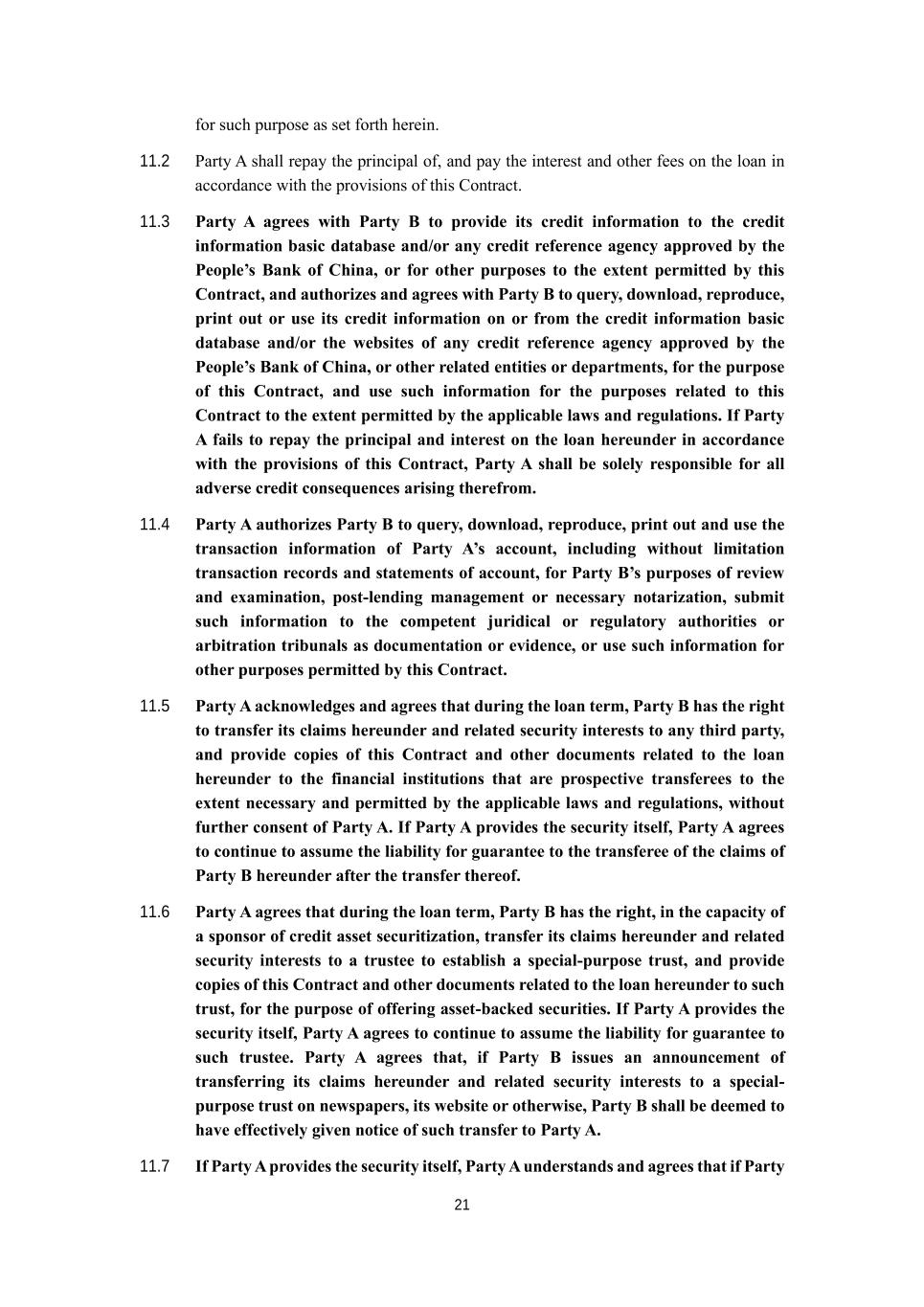 21 for such purpose as set forth herein. 11.2 Party A shall repay the principal of, and pay the interest and other fees on the loan in accordance with the provisions of this Contract. 11.3 Party A agrees with Party B to provide its credit information to the credit information basic database and/or any credit reference agency approved by the People’s Bank of China, or for other purposes to the extent permitted by this Contract, and authorizes and agrees with Party B to query, download, reproduce, print out or use its credit information on or from the credit information basic database and/or the websites of any credit reference agency approved by the People’s Bank of China, or other related entities or departments, for the purpose of this Contract, and use such information for the purposes related to this Contract to the extent permitted by the applicable laws and regulations. If Party A fails to repay the principal and interest on the loan hereunder in accordance with the provisions of this Contract, Party A shall be solely responsible for all adverse credit consequences arising therefrom. 11.4 Party A authorizes Party B to query, download, reproduce, print out and use the transaction information of Party A’s account, including without limitation transaction records and statements of account, for Party B’s purposes of review and examination, post-lending management or necessary notarization, submit such information to the competent juridical or regulatory authorities or arbitration tribunals as documentation or evidence, or use such information for other purposes permitted by this Contract. 11.5 Party A acknowledges and agrees that during the loan term, Party B has the right to transfer its claims hereunder and related security interests to any third party, and provide copies of this Contract and other documents related to the loan hereunder to the financial institutions that are prospective transferees to the extent necessary and permitted by the applicable laws and regulations, without further consent of Party A. If Party A provides the security itself, Party A agrees to continue to assume the liability for guarantee to the transferee of the claims of Party B hereunder after the transfer thereof. 11.6 Party A agrees that during the loan term, Party B has the right, in the capacity of a sponsor of credit asset securitization, transfer its claims hereunder and related security interests to a trustee to establish a special-purpose trust, and provide copies of this Contract and other documents related to the loan hereunder to such trust, for the purpose of offering asset-backed securities. If Party A provides the security itself, Party A agrees to continue to assume the liability for guarantee to such trustee. Party A agrees that, if Party B issues an announcement of transferring its claims hereunder and related security interests to a special- purpose trust on newspapers, its website or otherwise, Party B shall be deemed to have effectively given notice of such transfer to Party A. 11.7 If Party A provides the security itself, Party A understands and agrees that if Party