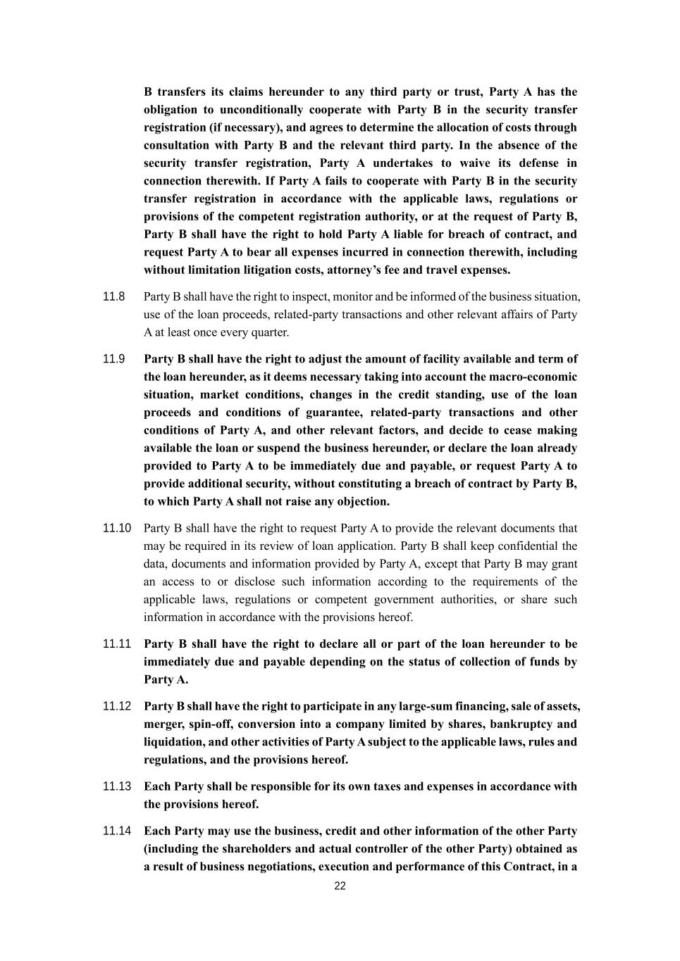 22 B transfers its claims hereunder to any third party or trust, Party A has the obligation to unconditionally cooperate with Party B in the security transfer registration (if necessary), and agrees to determine the allocation of costs through consultation with Party B and the relevant third party. In the absence of the security transfer registration, Party A undertakes to waive its defense in connection therewith. If Party A fails to cooperate with Party B in the security transfer registration in accordance with the applicable laws, regulations or provisions of the competent registration authority, or at the request of Party B, Party B shall have the right to hold Party A liable for breach of contract, and request Party A to bear all expenses incurred in connection therewith, including without limitation litigation costs, attorney’s fee and travel expenses. 11.8 Party B shall have the right to inspect, monitor and be informed of the business situation, use of the loan proceeds, related-party transactions and other relevant affairs of Party A at least once every quarter. 11.9 Party B shall have the right to adjust the amount of facility available and term of the loan hereunder, as it deems necessary taking into account the macro-economic situation, market conditions, changes in the credit standing, use of the loan proceeds and conditions of guarantee, related-party transactions and other conditions of Party A, and other relevant factors, and decide to cease making available the loan or suspend the business hereunder, or declare the loan already provided to Party A to be immediately due and payable, or request Party A to provide additional security, without constituting a breach of contract by Party B, to which Party A shall not raise any objection. 11.10 Party B shall have the right to request Party A to provide the relevant documents that may be required in its review of loan application. Party B shall keep confidential the data, documents and information provided by Party A, except that Party B may grant an access to or disclose such information according to the requirements of the applicable laws, regulations or competent government authorities, or share such information in accordance with the provisions hereof. 11.11 Party B shall have the right to declare all or part of the loan hereunder to be immediately due and payable depending on the status of collection of funds by Party A. 11.12 Party B shall have the right to participate in any large-sum financing, sale of assets, merger, spin-off, conversion into a company limited by shares, bankruptcy and liquidation, and other activities of Party A subject to the applicable laws, rules and regulations, and the provisions hereof. 11.13 Each Party shall be responsible for its own taxes and expenses in accordance with the provisions hereof. 11.14 Each Party may use the business, credit and other information of the other Party (including the shareholders and actual controller of the other Party) obtained as a result of business negotiations, execution and performance of this Contract, in a