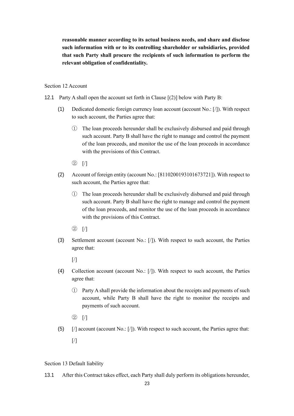 23 reasonable manner according to its actual business needs, and share and disclose such information with or to its controlling shareholder or subsidiaries, provided that such Party shall procure the recipients of such information to perform the relevant obligation of confidentiality. Section 12 Account 12.1 Party A shall open the account set forth in Clause [(2)] below with Party B: (1) Dedicated domestic foreign currency loan account (account No.: [/]). With respect to such account, the Parties agree that: ① The loan proceeds hereunder shall be exclusively disbursed and paid through such account. Party B shall have the right to manage and control the payment of the loan proceeds, and monitor the use of the loan proceeds in accordance with the provisions of this Contract. ② [/] (2) Account of foreign entity (account No.: [8110200193101673721]). With respect to such account, the Parties agree that: ① The loan proceeds hereunder shall be exclusively disbursed and paid through such account. Party B shall have the right to manage and control the payment of the loan proceeds, and monitor the use of the loan proceeds in accordance with the provisions of this Contract. ② [/] (3) Settlement account (account No.: [/]). With respect to such account, the Parties agree that: [/] (4) Collection account (account No.: [/]). With respect to such account, the Parties agree that: ① Party A shall provide the information about the receipts and payments of such account, while Party B shall have the right to monitor the receipts and payments of such account. ② [/] (5) [/] account (account No.: [/]). With respect to such account, the Parties agree that: [/] Section 13 Default liability 13.1 After this Contract takes effect, each Party shall duly perform its obligations hereunder,