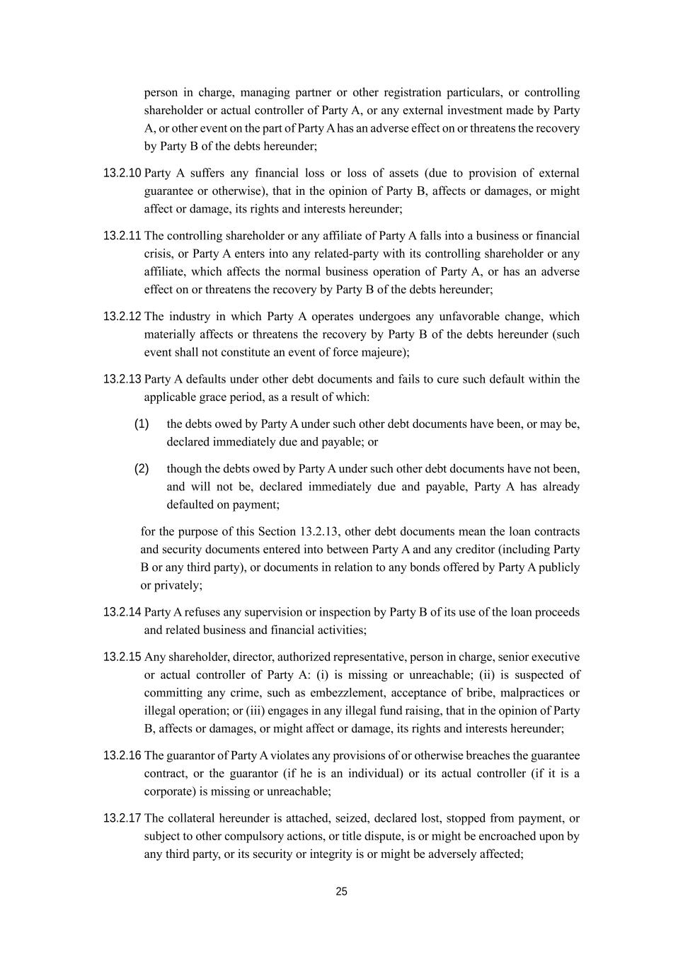 25 person in charge, managing partner or other registration particulars, or controlling shareholder or actual controller of Party A, or any external investment made by Party A, or other event on the part of Party A has an adverse effect on or threatens the recovery by Party B of the debts hereunder; 13.2.10 Party A suffers any financial loss or loss of assets (due to provision of external guarantee or otherwise), that in the opinion of Party B, affects or damages, or might affect or damage, its rights and interests hereunder; 13.2.11 The controlling shareholder or any affiliate of Party A falls into a business or financial crisis, or Party A enters into any related-party with its controlling shareholder or any affiliate, which affects the normal business operation of Party A, or has an adverse effect on or threatens the recovery by Party B of the debts hereunder; 13.2.12 The industry in which Party A operates undergoes any unfavorable change, which materially affects or threatens the recovery by Party B of the debts hereunder (such event shall not constitute an event of force majeure); 13.2.13 Party A defaults under other debt documents and fails to cure such default within the applicable grace period, as a result of which: (1) the debts owed by Party A under such other debt documents have been, or may be, declared immediately due and payable; or (2) though the debts owed by Party A under such other debt documents have not been, and will not be, declared immediately due and payable, Party A has already defaulted on payment; for the purpose of this Section 13.2.13, other debt documents mean the loan contracts and security documents entered into between Party A and any creditor (including Party B or any third party), or documents in relation to any bonds offered by Party A publicly or privately; 13.2.14 Party A refuses any supervision or inspection by Party B of its use of the loan proceeds and related business and financial activities; 13.2.15 Any shareholder, director, authorized representative, person in charge, senior executive or actual controller of Party A: (i) is missing or unreachable; (ii) is suspected of committing any crime, such as embezzlement, acceptance of bribe, malpractices or illegal operation; or (iii) engages in any illegal fund raising, that in the opinion of Party B, affects or damages, or might affect or damage, its rights and interests hereunder; 13.2.16 The guarantor of Party A violates any provisions of or otherwise breaches the guarantee contract, or the guarantor (if he is an individual) or its actual controller (if it is a corporate) is missing or unreachable; 13.2.17 The collateral hereunder is attached, seized, declared lost, stopped from payment, or subject to other compulsory actions, or title dispute, is or might be encroached upon by any third party, or its security or integrity is or might be adversely affected;