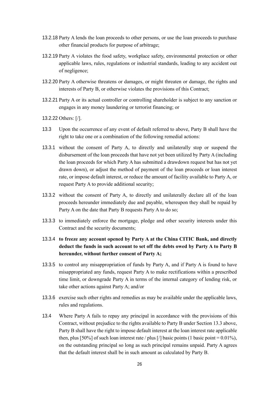 26 13.2.18 Party A lends the loan proceeds to other persons, or use the loan proceeds to purchase other financial products for purpose of arbitrage; 13.2.19 Party A violates the food safety, workplace safety, environmental protection or other applicable laws, rules, regulations or industrial standards, leading to any accident out of negligence; 13.2.20 Party A otherwise threatens or damages, or might threaten or damage, the rights and interests of Party B, or otherwise violates the provisions of this Contract; 13.2.21 Party A or its actual controller or controlling shareholder is subject to any sanction or engages in any money laundering or terrorist financing; or 13.2.22 Others: [/]. 13.3 Upon the occurrence of any event of default referred to above, Party B shall have the right to take one or a combination of the following remedial actions: 13.3.1 without the consent of Party A, to directly and unilaterally stop or suspend the disbursement of the loan proceeds that have not yet been utilized by Party A (including the loan proceeds for which Party A has submitted a drawdown request but has not yet drawn down), or adjust the method of payment of the loan proceeds or loan interest rate, or impose default interest, or reduce the amount of facility available to Party A, or request Party A to provide additional security; 13.3.2 without the consent of Party A, to directly and unilaterally declare all of the loan proceeds hereunder immediately due and payable, whereupon they shall be repaid by Party A on the date that Party B requests Party A to do so; 13.3.3 to immediately enforce the mortgage, pledge and other security interests under this Contract and the security documents; 13.3.4 to freeze any account opened by Party A at the China CITIC Bank, and directly deduct the funds in such account to set off the debts owed by Party A to Party B hereunder, without further consent of Party A; 13.3.5 to control any misappropriation of funds by Party A, and if Party A is found to have misappropriated any funds, request Party A to make rectifications within a prescribed time limit, or downgrade Party A in terms of the internal category of lending risk, or take other actions against Party A; and/or 13.3.6 exercise such other rights and remedies as may be available under the applicable laws, rules and regulations. 13.4 Where Party A fails to repay any principal in accordance with the provisions of this Contract, without prejudice to the rights available to Party B under Section 13.3 above, Party B shall have the right to impose default interest at the loan interest rate applicable then, plus [50%] of such loan interest rate / plus [/] basic points (1 basic point = 0.01%), on the outstanding principal so long as such principal remains unpaid. Party A agrees that the default interest shall be in such amount as calculated by Party B.