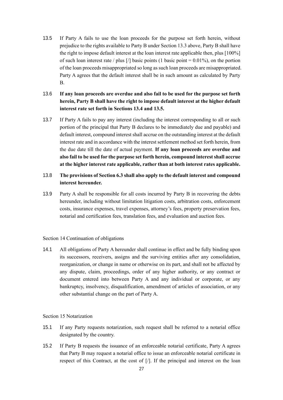 27 13.5 If Party A fails to use the loan proceeds for the purpose set forth herein, without prejudice to the rights available to Party B under Section 13.3 above, Party B shall have the right to impose default interest at the loan interest rate applicable then, plus [100%] of such loan interest rate / plus [/] basic points (1 basic point = 0.01%), on the portion of the loan proceeds misappropriated so long as such loan proceeds are misappropriated. Party A agrees that the default interest shall be in such amount as calculated by Party B. 13.6 If any loan proceeds are overdue and also fail to be used for the purpose set forth herein, Party B shall have the right to impose default interest at the higher default interest rate set forth in Sections 13.4 and 13.5. 13.7 If Party A fails to pay any interest (including the interest corresponding to all or such portion of the principal that Party B declares to be immediately due and payable) and default interest, compound interest shall accrue on the outstanding interest at the default interest rate and in accordance with the interest settlement method set forth herein, from the due date till the date of actual payment. If any loan proceeds are overdue and also fail to be used for the purpose set forth herein, compound interest shall accrue at the higher interest rate applicable, rather than at both interest rates applicable. 13.8 The provisions of Section 6.3 shall also apply to the default interest and compound interest hereunder. 13.9 Party A shall be responsible for all costs incurred by Party B in recovering the debts hereunder, including without limitation litigation costs, arbitration costs, enforcement costs, insurance expenses, travel expenses, attorney’s fees, property preservation fees, notarial and certification fees, translation fees, and evaluation and auction fees. Section 14 Continuation of obligations 14.1 All obligations of Party A hereunder shall continue in effect and be fully binding upon its successors, receivers, assigns and the surviving entities after any consolidation, reorganization, or change in name or otherwise on its part, and shall not be affected by any dispute, claim, proceedings, order of any higher authority, or any contract or document entered into between Party A and any individual or corporate, or any bankruptcy, insolvency, disqualification, amendment of articles of association, or any other substantial change on the part of Party A. Section 15 Notarization 15.1 If any Party requests notarization, such request shall be referred to a notarial office designated by the country. 15.2 If Party B requests the issuance of an enforceable notarial certificate, Party A agrees that Party B may request a notarial office to issue an enforceable notarial certificate in respect of this Contract, at the cost of [/]. If the principal and interest on the loan