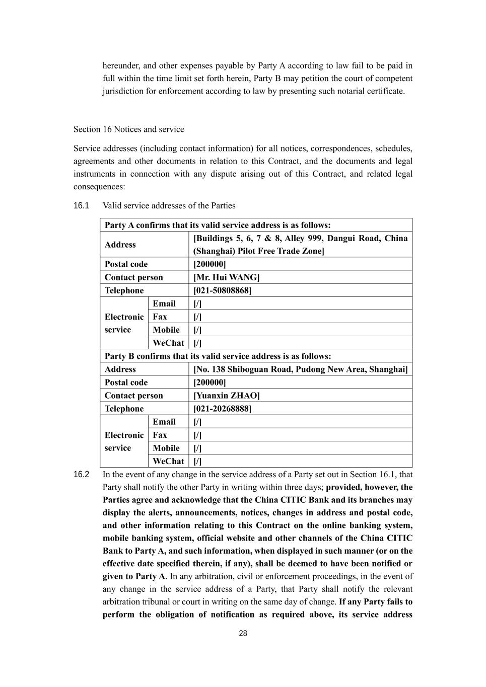 28 hereunder, and other expenses payable by Party A according to law fail to be paid in full within the time limit set forth herein, Party B may petition the court of competent jurisdiction for enforcement according to law by presenting such notarial certificate. Section 16 Notices and service Service addresses (including contact information) for all notices, correspondences, schedules, agreements and other documents in relation to this Contract, and the documents and legal instruments in connection with any dispute arising out of this Contract, and related legal consequences: 16.1 Valid service addresses of the Parties Party A confirms that its valid service address is as follows: Address [Buildings 5, 6, 7 & 8, Alley 999, Dangui Road, China (Shanghai) Pilot Free Trade Zone] Postal code [200000] Contact person [Mr. Hui WANG] Telephone [021-50808868] Electronic service Email [/] Fax [/] Mobile [/] WeChat [/] Party B confirms that its valid service address is as follows: Address [No. 138 Shiboguan Road, Pudong New Area, Shanghai] Postal code [200000] Contact person [Yuanxin ZHAO] Telephone [021-20268888] Electronic service Email [/] Fax [/] Mobile [/] WeChat [/] 16.2 In the event of any change in the service address of a Party set out in Section 16.1, that Party shall notify the other Party in writing within three days; provided, however, the Parties agree and acknowledge that the China CITIC Bank and its branches may display the alerts, announcements, notices, changes in address and postal code, and other information relating to this Contract on the online banking system, mobile banking system, official website and other channels of the China CITIC Bank to Party A, and such information, when displayed in such manner (or on the effective date specified therein, if any), shall be deemed to have been notified or given to Party A. In any arbitration, civil or enforcement proceedings, in the event of any change in the service address of a Party, that Party shall notify the relevant arbitration tribunal or court in writing on the same day of change. If any Party fails to perform the obligation of notification as required above, its service address
