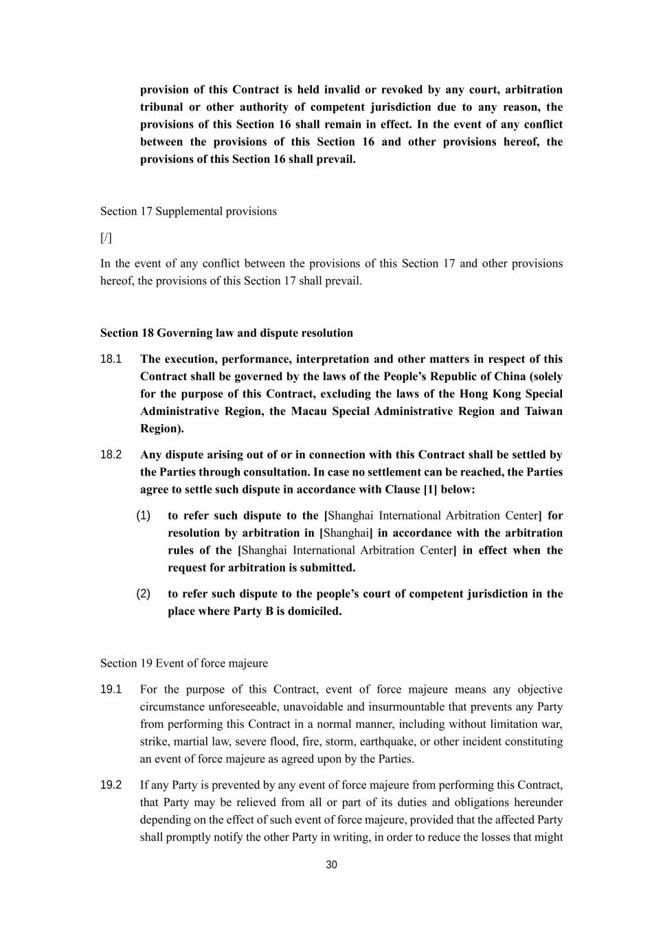 30 provision of this Contract is held invalid or revoked by any court, arbitration tribunal or other authority of competent jurisdiction due to any reason, the provisions of this Section 16 shall remain in effect. In the event of any conflict between the provisions of this Section 16 and other provisions hereof, the provisions of this Section 16 shall prevail. Section 17 Supplemental provisions [/] In the event of any conflict between the provisions of this Section 17 and other provisions hereof, the provisions of this Section 17 shall prevail. Section 18 Governing law and dispute resolution 18.1 The execution, performance, interpretation and other matters in respect of this Contract shall be governed by the laws of the People’s Republic of China (solely for the purpose of this Contract, excluding the laws of the Hong Kong Special Administrative Region, the Macau Special Administrative Region and Taiwan Region). 18.2 Any dispute arising out of or in connection with this Contract shall be settled by the Parties through consultation. In case no settlement can be reached, the Parties agree to settle such dispute in accordance with Clause [1] below: (1) to refer such dispute to the [Shanghai International Arbitration Center] for resolution by arbitration in [Shanghai] in accordance with the arbitration rules of the [Shanghai International Arbitration Center] in effect when the request for arbitration is submitted. (2) to refer such dispute to the people’s court of competent jurisdiction in the place where Party B is domiciled. Section 19 Event of force majeure 19.1 For the purpose of this Contract, event of force majeure means any objective circumstance unforeseeable, unavoidable and insurmountable that prevents any Party from performing this Contract in a normal manner, including without limitation war, strike, martial law, severe flood, fire, storm, earthquake, or other incident constituting an event of force majeure as agreed upon by the Parties. 19.2 If any Party is prevented by any event of force majeure from performing this Contract, that Party may be relieved from all or part of its duties and obligations hereunder depending on the effect of such event of force majeure, provided that the affected Party shall promptly notify the other Party in writing, in order to reduce the losses that might