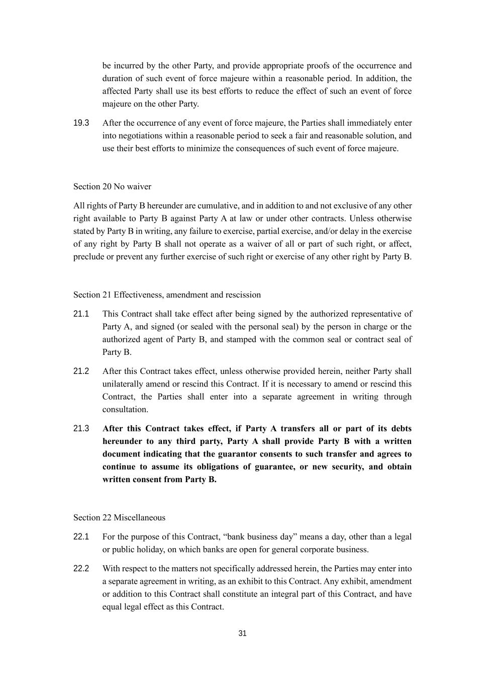 31 be incurred by the other Party, and provide appropriate proofs of the occurrence and duration of such event of force majeure within a reasonable period. In addition, the affected Party shall use its best efforts to reduce the effect of such an event of force majeure on the other Party. 19.3 After the occurrence of any event of force majeure, the Parties shall immediately enter into negotiations within a reasonable period to seek a fair and reasonable solution, and use their best efforts to minimize the consequences of such event of force majeure. Section 20 No waiver All rights of Party B hereunder are cumulative, and in addition to and not exclusive of any other right available to Party B against Party A at law or under other contracts. Unless otherwise stated by Party B in writing, any failure to exercise, partial exercise, and/or delay in the exercise of any right by Party B shall not operate as a waiver of all or part of such right, or affect, preclude or prevent any further exercise of such right or exercise of any other right by Party B. Section 21 Effectiveness, amendment and rescission 21.1 This Contract shall take effect after being signed by the authorized representative of Party A, and signed (or sealed with the personal seal) by the person in charge or the authorized agent of Party B, and stamped with the common seal or contract seal of Party B. 21.2 After this Contract takes effect, unless otherwise provided herein, neither Party shall unilaterally amend or rescind this Contract. If it is necessary to amend or rescind this Contract, the Parties shall enter into a separate agreement in writing through consultation. 21.3 After this Contract takes effect, if Party A transfers all or part of its debts hereunder to any third party, Party A shall provide Party B with a written document indicating that the guarantor consents to such transfer and agrees to continue to assume its obligations of guarantee, or new security, and obtain written consent from Party B. Section 22 Miscellaneous 22.1 For the purpose of this Contract, “bank business day” means a day, other than a legal or public holiday, on which banks are open for general corporate business. 22.2 With respect to the matters not specifically addressed herein, the Parties may enter into a separate agreement in writing, as an exhibit to this Contract. Any exhibit, amendment or addition to this Contract shall constitute an integral part of this Contract, and have equal legal effect as this Contract.