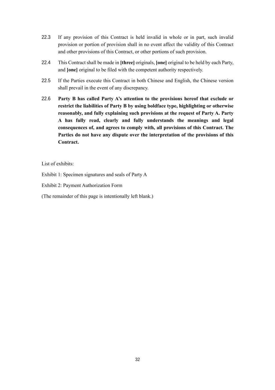 32 22.3 If any provision of this Contract is held invalid in whole or in part, such invalid provision or portion of provision shall in no event affect the validity of this Contract and other provisions of this Contract, or other portions of such provision. 22.4 This Contract shall be made in [three] originals, [one] original to be held by each Party, and [one] original to be filed with the competent authority respectively. 22.5 If the Parties execute this Contract in both Chinese and English, the Chinese version shall prevail in the event of any discrepancy. 22.6 Party B has called Party A’s attention to the provisions hereof that exclude or restrict the liabilities of Party B by using boldface type, highlighting or otherwise reasonably, and fully explaining such provisions at the request of Party A. Party A has fully read, clearly and fully understands the meanings and legal consequences of, and agrees to comply with, all provisions of this Contract. The Parties do not have any dispute over the interpretation of the provisions of this Contract. List of exhibits: Exhibit 1: Specimen signatures and seals of Party A Exhibit 2: Payment Authorization Form (The remainder of this page is intentionally left blank.)