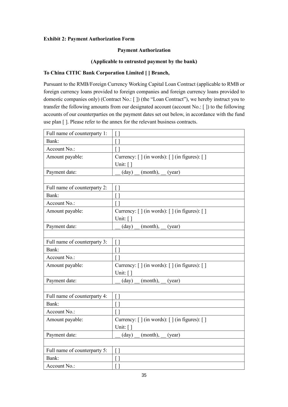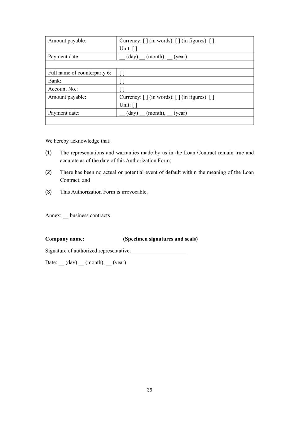 36 Amount payable: Currency: [ ] (in words): [ ] (in figures): [ ] Unit: [ ] Payment date: __ (day) __ (month), __ (year) Full name of counterparty 6: [ ] Bank: [ ] Account No.: [ ] Amount payable: Currency: [ ] (in words): [ ] (in figures): [ ] Unit: [ ] Payment date: __ (day) __ (month), __ (year) We hereby acknowledge that: (1) The representations and warranties made by us in the Loan Contract remain true and accurate as of the date of this Authorization Form; (2) There has been no actual or potential event of default within the meaning of the Loan Contract; and (3) This Authorization Form is irrevocable. Annex: __ business contracts Company name: (Specimen signatures and seals) Signature of authorized representative: Date: __ (day) __ (month), __ (year)