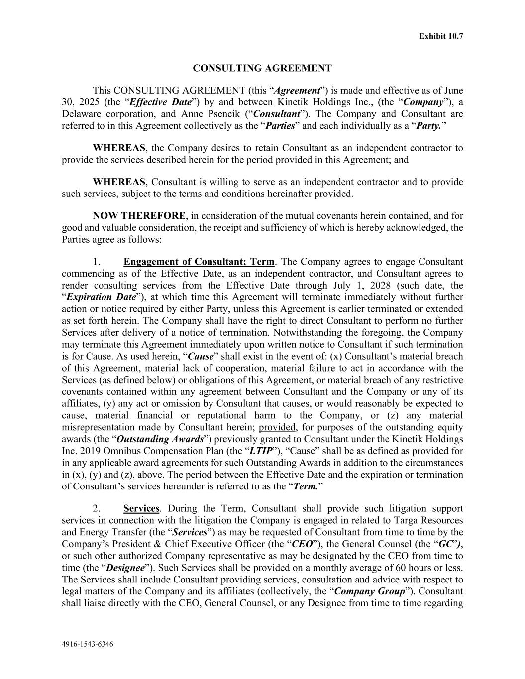 Exhibit 10.7 4916-1543-6346 CONSULTING AGREEMENT This CONSULTING AGREEMENT (this “Agreement”) is made and effective as of June 30, 2025 (the “Effective Date”) by and between Kinetik Holdings Inc., (the “Company”), a Delaware corporation, and Anne Psencik (“Consultant”). The Company and Consultant are referred to in this Agreement collectively as the “Parties” and each individually as a “Party.” WHEREAS, the Company desires to retain Consultant as an independent contractor to provide the services described herein for the period provided in this Agreement; and WHEREAS, Consultant is willing to serve as an independent contractor and to provide such services, subject to the terms and conditions hereinafter provided. NOW THEREFORE, in consideration of the mutual covenants herein contained, and for good and valuable consideration, the receipt and sufficiency of which is hereby acknowledged, the Parties agree as follows: 1. Engagement of Consultant; Term. The Company agrees to engage Consultant commencing as of the Effective Date, as an independent contractor, and Consultant agrees to render consulting services from the Effective Date through July 1, 2028 (such date, the “Expiration Date”), at which time this Agreement will terminate immediately without further action or notice required by either Party, unless this Agreement is earlier terminated or extended as set forth herein. The Company shall have the right to direct Consultant to perform no further Services after delivery of a notice of termination. Notwithstanding the foregoing, the Company may terminate this Agreement immediately upon written notice to Consultant if such termination is for Cause. As used herein, “Cause” shall exist in the event of: (x) Consultant’s material breach of this Agreement, material lack of cooperation, material failure to act in accordance with the Services (as defined below) or obligations of this Agreement, or material breach of any restrictive covenants contained within any agreement between Consultant and the Company or any of its affiliates, (y) any act or omission by Consultant that causes, or would reasonably be expected to cause, material financial or reputational harm to the Company, or (z) any material misrepresentation made by Consultant herein; provided, for purposes of the outstanding equity awards (the “Outstanding Awards”) previously granted to Consultant under the Kinetik Holdings Inc. 2019 Omnibus Compensation Plan (the “LTIP”), “Cause” shall be as defined as provided for in any applicable award agreements for such Outstanding Awards in addition to the circumstances in (x), (y) and (z), above. The period between the Effective Date and the expiration or termination of Consultant’s services hereunder is referred to as the “Term.” 2. Services. During the Term, Consultant shall provide such litigation support services in connection with the litigation the Company is engaged in related to Targa Resources and Energy Transfer (the “Services”) as may be requested of Consultant from time to time by the Company’s President & Chief Executive Officer (the “CEO”), the General Counsel (the “GC”), or such other authorized Company representative as may be designated by the CEO from time to time (the “Designee”). Such Services shall be provided on a monthly average of 60 hours or less. The Services shall include Consultant providing services, consultation and advice with respect to legal matters of the Company and its affiliates (collectively, the “Company Group”). Consultant shall liaise directly with the CEO, General Counsel, or any Designee from time to time regarding
