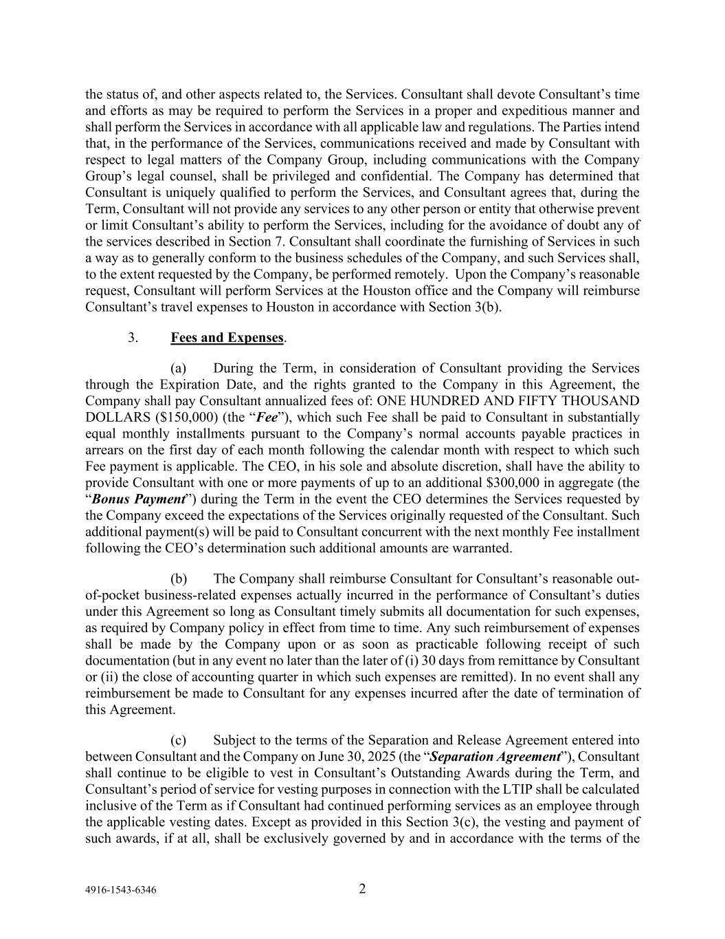 4916-1543-6346 2 the status of, and other aspects related to, the Services. Consultant shall devote Consultant’s time and efforts as may be required to perform the Services in a proper and expeditious manner and shall perform the Services in accordance with all applicable law and regulations. The Parties intend that, in the performance of the Services, communications received and made by Consultant with respect to legal matters of the Company Group, including communications with the Company Group’s legal counsel, shall be privileged and confidential. The Company has determined that Consultant is uniquely qualified to perform the Services, and Consultant agrees that, during the Term, Consultant will not provide any services to any other person or entity that otherwise prevent or limit Consultant’s ability to perform the Services, including for the avoidance of doubt any of the services described in Section 7. Consultant shall coordinate the furnishing of Services in such a way as to generally conform to the business schedules of the Company, and such Services shall, to the extent requested by the Company, be performed remotely. Upon the Company’s reasonable request, Consultant will perform Services at the Houston office and the Company will reimburse Consultant’s travel expenses to Houston in accordance with Section 3(b). 3. Fees and Expenses. (a) During the Term, in consideration of Consultant providing the Services through the Expiration Date, and the rights granted to the Company in this Agreement, the Company shall pay Consultant annualized fees of: ONE HUNDRED AND FIFTY THOUSAND DOLLARS ($150,000) (the “Fee”), which such Fee shall be paid to Consultant in substantially equal monthly installments pursuant to the Company’s normal accounts payable practices in arrears on the first day of each month following the calendar month with respect to which such Fee payment is applicable. The CEO, in his sole and absolute discretion, shall have the ability to provide Consultant with one or more payments of up to an additional $300,000 in aggregate (the “Bonus Payment”) during the Term in the event the CEO determines the Services requested by the Company exceed the expectations of the Services originally requested of the Consultant. Such additional payment(s) will be paid to Consultant concurrent with the next monthly Fee installment following the CEO’s determination such additional amounts are warranted. (b) The Company shall reimburse Consultant for Consultant’s reasonable out- of-pocket business-related expenses actually incurred in the performance of Consultant’s duties under this Agreement so long as Consultant timely submits all documentation for such expenses, as required by Company policy in effect from time to time. Any such reimbursement of expenses shall be made by the Company upon or as soon as practicable following receipt of such documentation (but in any event no later than the later of (i) 30 days from remittance by Consultant or (ii) the close of accounting quarter in which such expenses are remitted). In no event shall any reimbursement be made to Consultant for any expenses incurred after the date of termination of this Agreement. (c) Subject to the terms of the Separation and Release Agreement entered into between Consultant and the Company on June 30, 2025 (the “Separation Agreement”), Consultant shall continue to be eligible to vest in Consultant’s Outstanding Awards during the Term, and Consultant’s period of service for vesting purposes in connection with the LTIP shall be calculated inclusive of the Term as if Consultant had continued performing services as an employee through the applicable vesting dates. Except as provided in this Section 3(c), the vesting and payment of such awards, if at all, shall be exclusively governed by and in accordance with the terms of the