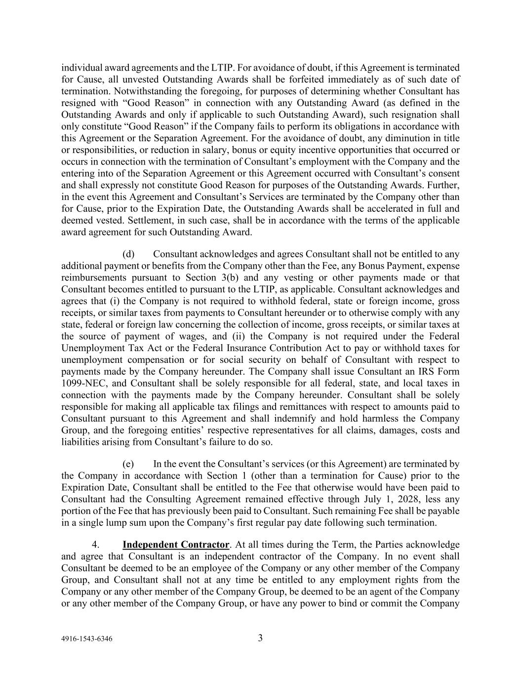 4916-1543-6346 3 individual award agreements and the LTIP. For avoidance of doubt, if this Agreement is terminated for Cause, all unvested Outstanding Awards shall be forfeited immediately as of such date of termination. Notwithstanding the foregoing, for purposes of determining whether Consultant has resigned with “Good Reason” in connection with any Outstanding Award (as defined in the Outstanding Awards and only if applicable to such Outstanding Award), such resignation shall only constitute “Good Reason” if the Company fails to perform its obligations in accordance with this Agreement or the Separation Agreement. For the avoidance of doubt, any diminution in title or responsibilities, or reduction in salary, bonus or equity incentive opportunities that occurred or occurs in connection with the termination of Consultant’s employment with the Company and the entering into of the Separation Agreement or this Agreement occurred with Consultant’s consent and shall expressly not constitute Good Reason for purposes of the Outstanding Awards. Further, in the event this Agreement and Consultant’s Services are terminated by the Company other than for Cause, prior to the Expiration Date, the Outstanding Awards shall be accelerated in full and deemed vested. Settlement, in such case, shall be in accordance with the terms of the applicable award agreement for such Outstanding Award. (d) Consultant acknowledges and agrees Consultant shall not be entitled to any additional payment or benefits from the Company other than the Fee, any Bonus Payment, expense reimbursements pursuant to Section 3(b) and any vesting or other payments made or that Consultant becomes entitled to pursuant to the LTIP, as applicable. Consultant acknowledges and agrees that (i) the Company is not required to withhold federal, state or foreign income, gross receipts, or similar taxes from payments to Consultant hereunder or to otherwise comply with any state, federal or foreign law concerning the collection of income, gross receipts, or similar taxes at the source of payment of wages, and (ii) the Company is not required under the Federal Unemployment Tax Act or the Federal Insurance Contribution Act to pay or withhold taxes for unemployment compensation or for social security on behalf of Consultant with respect to payments made by the Company hereunder. The Company shall issue Consultant an IRS Form 1099-NEC, and Consultant shall be solely responsible for all federal, state, and local taxes in connection with the payments made by the Company hereunder. Consultant shall be solely responsible for making all applicable tax filings and remittances with respect to amounts paid to Consultant pursuant to this Agreement and shall indemnify and hold harmless the Company Group, and the foregoing entities’ respective representatives for all claims, damages, costs and liabilities arising from Consultant’s failure to do so. (e) In the event the Consultant’s services (or this Agreement) are terminated by the Company in accordance with Section 1 (other than a termination for Cause) prior to the Expiration Date, Consultant shall be entitled to the Fee that otherwise would have been paid to Consultant had the Consulting Agreement remained effective through July 1, 2028, less any portion of the Fee that has previously been paid to Consultant. Such remaining Fee shall be payable in a single lump sum upon the Company’s first regular pay date following such termination. 4. Independent Contractor. At all times during the Term, the Parties acknowledge and agree that Consultant is an independent contractor of the Company. In no event shall Consultant be deemed to be an employee of the Company or any other member of the Company Group, and Consultant shall not at any time be entitled to any employment rights from the Company or any other member of the Company Group, be deemed to be an agent of the Company or any other member of the Company Group, or have any power to bind or commit the Company