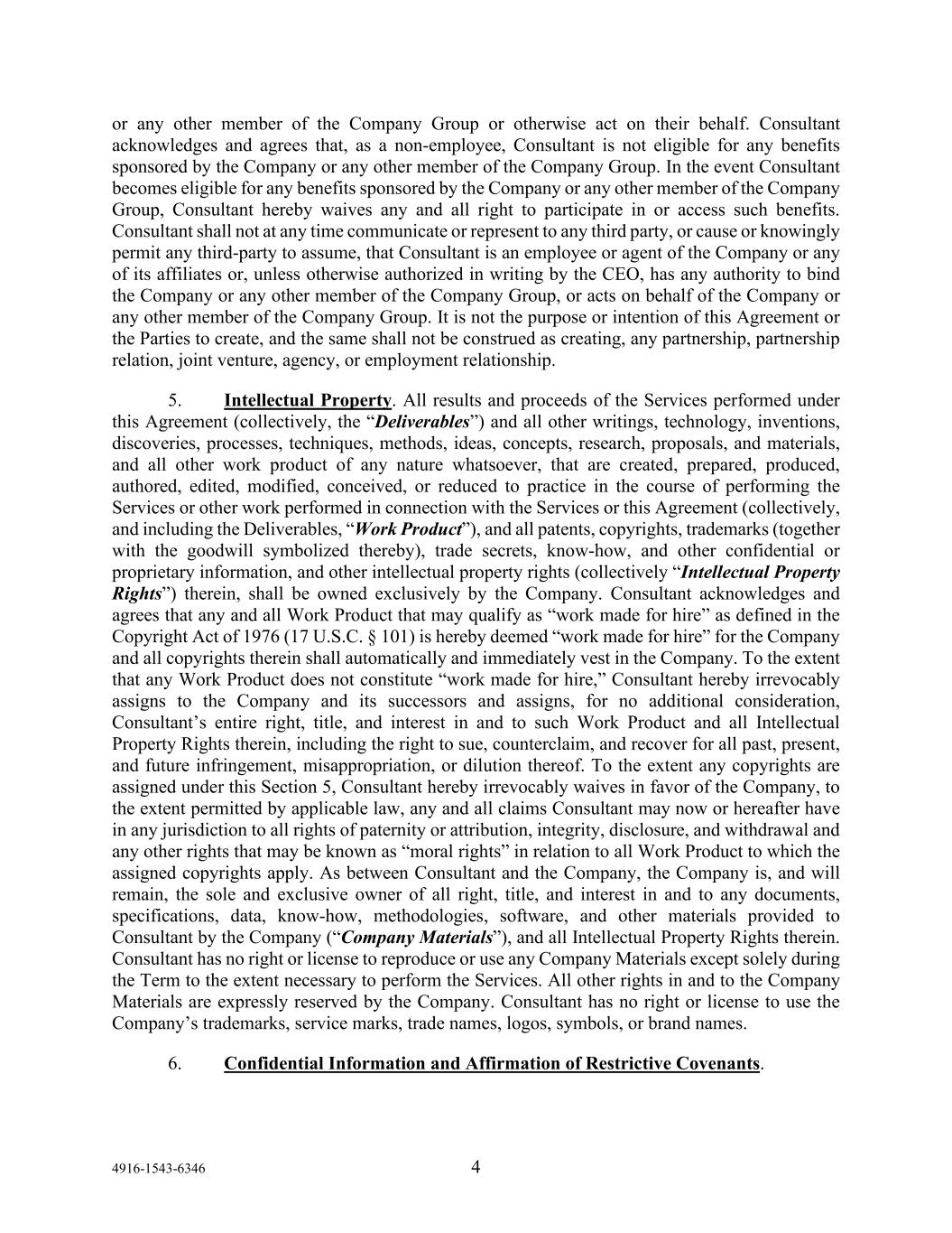 4916-1543-6346 4 or any other member of the Company Group or otherwise act on their behalf. Consultant acknowledges and agrees that, as a non-employee, Consultant is not eligible for any benefits sponsored by the Company or any other member of the Company Group. In the event Consultant becomes eligible for any benefits sponsored by the Company or any other member of the Company Group, Consultant hereby waives any and all right to participate in or access such benefits. Consultant shall not at any time communicate or represent to any third party, or cause or knowingly permit any third-party to assume, that Consultant is an employee or agent of the Company or any of its affiliates or, unless otherwise authorized in writing by the CEO, has any authority to bind the Company or any other member of the Company Group, or acts on behalf of the Company or any other member of the Company Group. It is not the purpose or intention of this Agreement or the Parties to create, and the same shall not be construed as creating, any partnership, partnership relation, joint venture, agency, or employment relationship. 5. Intellectual Property. All results and proceeds of the Services performed under this Agreement (collectively, the “Deliverables”) and all other writings, technology, inventions, discoveries, processes, techniques, methods, ideas, concepts, research, proposals, and materials, and all other work product of any nature whatsoever, that are created, prepared, produced, authored, edited, modified, conceived, or reduced to practice in the course of performing the Services or other work performed in connection with the Services or this Agreement (collectively, and including the Deliverables, “Work Product”), and all patents, copyrights, trademarks (together with the goodwill symbolized thereby), trade secrets, know-how, and other confidential or proprietary information, and other intellectual property rights (collectively “Intellectual Property Rights”) therein, shall be owned exclusively by the Company. Consultant acknowledges and agrees that any and all Work Product that may qualify as “work made for hire” as defined in the Copyright Act of 1976 (17 U.S.C. § 101) is hereby deemed “work made for hire” for the Company and all copyrights therein shall automatically and immediately vest in the Company. To the extent that any Work Product does not constitute “work made for hire,” Consultant hereby irrevocably assigns to the Company and its successors and assigns, for no additional consideration, Consultant’s entire right, title, and interest in and to such Work Product and all Intellectual Property Rights therein, including the right to sue, counterclaim, and recover for all past, present, and future infringement, misappropriation, or dilution thereof. To the extent any copyrights are assigned under this Section 5, Consultant hereby irrevocably waives in favor of the Company, to the extent permitted by applicable law, any and all claims Consultant may now or hereafter have in any jurisdiction to all rights of paternity or attribution, integrity, disclosure, and withdrawal and any other rights that may be known as “moral rights” in relation to all Work Product to which the assigned copyrights apply. As between Consultant and the Company, the Company is, and will remain, the sole and exclusive owner of all right, title, and interest in and to any documents, specifications, data, know-how, methodologies, software, and other materials provided to Consultant by the Company (“Company Materials”), and all Intellectual Property Rights therein. Consultant has no right or license to reproduce or use any Company Materials except solely during the Term to the extent necessary to perform the Services. All other rights in and to the Company Materials are expressly reserved by the Company. Consultant has no right or license to use the Company’s trademarks, service marks, trade names, logos, symbols, or brand names. 6. Confidential Information and Affirmation of Restrictive Covenants.