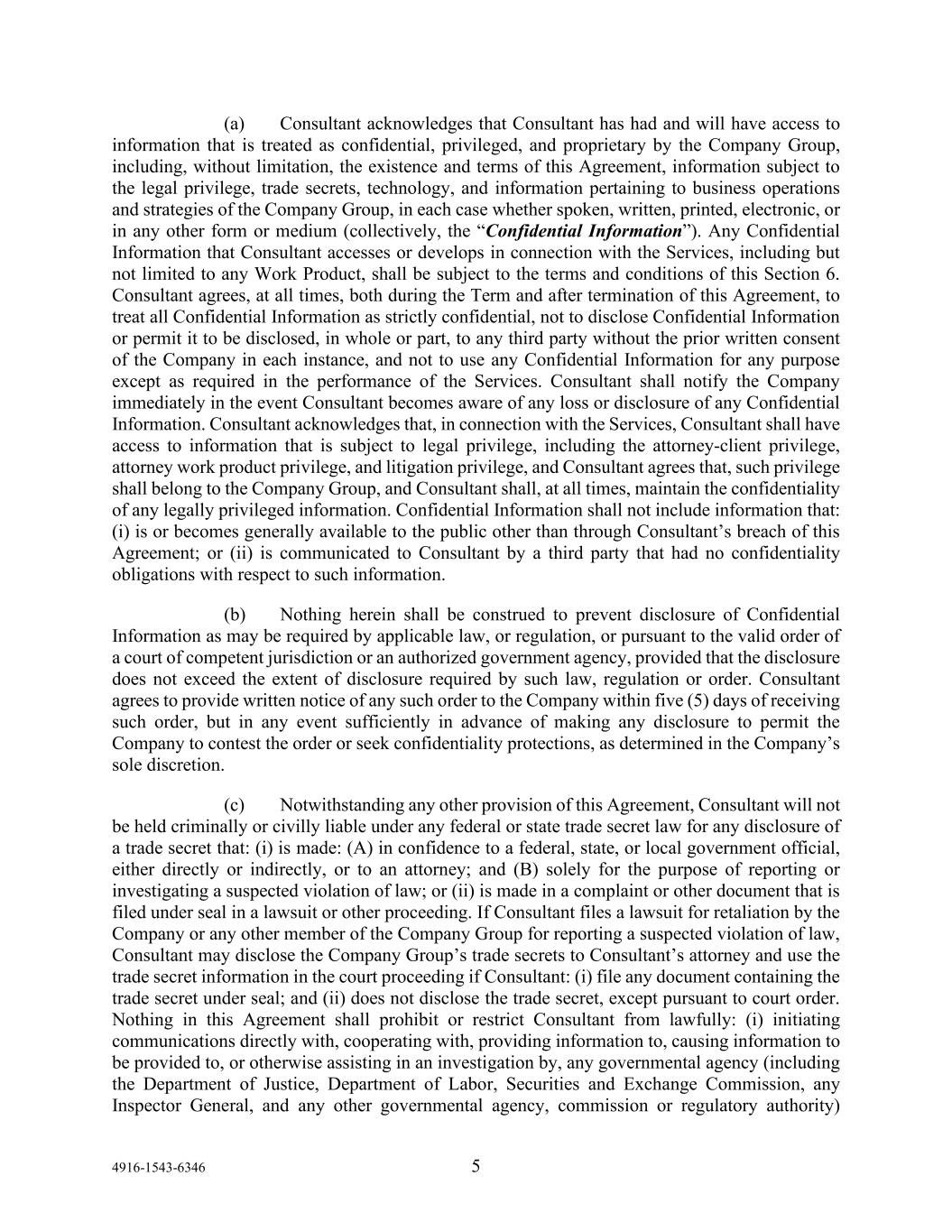 4916-1543-6346 5 (a) Consultant acknowledges that Consultant has had and will have access to information that is treated as confidential, privileged, and proprietary by the Company Group, including, without limitation, the existence and terms of this Agreement, information subject to the legal privilege, trade secrets, technology, and information pertaining to business operations and strategies of the Company Group, in each case whether spoken, written, printed, electronic, or in any other form or medium (collectively, the “Confidential Information”). Any Confidential Information that Consultant accesses or develops in connection with the Services, including but not limited to any Work Product, shall be subject to the terms and conditions of this Section 6. Consultant agrees, at all times, both during the Term and after termination of this Agreement, to treat all Confidential Information as strictly confidential, not to disclose Confidential Information or permit it to be disclosed, in whole or part, to any third party without the prior written consent of the Company in each instance, and not to use any Confidential Information for any purpose except as required in the performance of the Services. Consultant shall notify the Company immediately in the event Consultant becomes aware of any loss or disclosure of any Confidential Information. Consultant acknowledges that, in connection with the Services, Consultant shall have access to information that is subject to legal privilege, including the attorney-client privilege, attorney work product privilege, and litigation privilege, and Consultant agrees that, such privilege shall belong to the Company Group, and Consultant shall, at all times, maintain the confidentiality of any legally privileged information. Confidential Information shall not include information that: (i) is or becomes generally available to the public other than through Consultant’s breach of this Agreement; or (ii) is communicated to Consultant by a third party that had no confidentiality obligations with respect to such information. (b) Nothing herein shall be construed to prevent disclosure of Confidential Information as may be required by applicable law, or regulation, or pursuant to the valid order of a court of competent jurisdiction or an authorized government agency, provided that the disclosure does not exceed the extent of disclosure required by such law, regulation or order. Consultant agrees to provide written notice of any such order to the Company within five (5) days of receiving such order, but in any event sufficiently in advance of making any disclosure to permit the Company to contest the order or seek confidentiality protections, as determined in the Company’s sole discretion. (c) Notwithstanding any other provision of this Agreement, Consultant will not be held criminally or civilly liable under any federal or state trade secret law for any disclosure of a trade secret that: (i) is made: (A) in confidence to a federal, state, or local government official, either directly or indirectly, or to an attorney; and (B) solely for the purpose of reporting or investigating a suspected violation of law; or (ii) is made in a complaint or other document that is filed under seal in a lawsuit or other proceeding. If Consultant files a lawsuit for retaliation by the Company or any other member of the Company Group for reporting a suspected violation of law, Consultant may disclose the Company Group’s trade secrets to Consultant’s attorney and use the trade secret information in the court proceeding if Consultant: (i) file any document containing the trade secret under seal; and (ii) does not disclose the trade secret, except pursuant to court order. Nothing in this Agreement shall prohibit or restrict Consultant from lawfully: (i) initiating communications directly with, cooperating with, providing information to, causing information to be provided to, or otherwise assisting in an investigation by, any governmental agency (including the Department of Justice, Department of Labor, Securities and Exchange Commission, any Inspector General, and any other governmental agency, commission or regulatory authority)