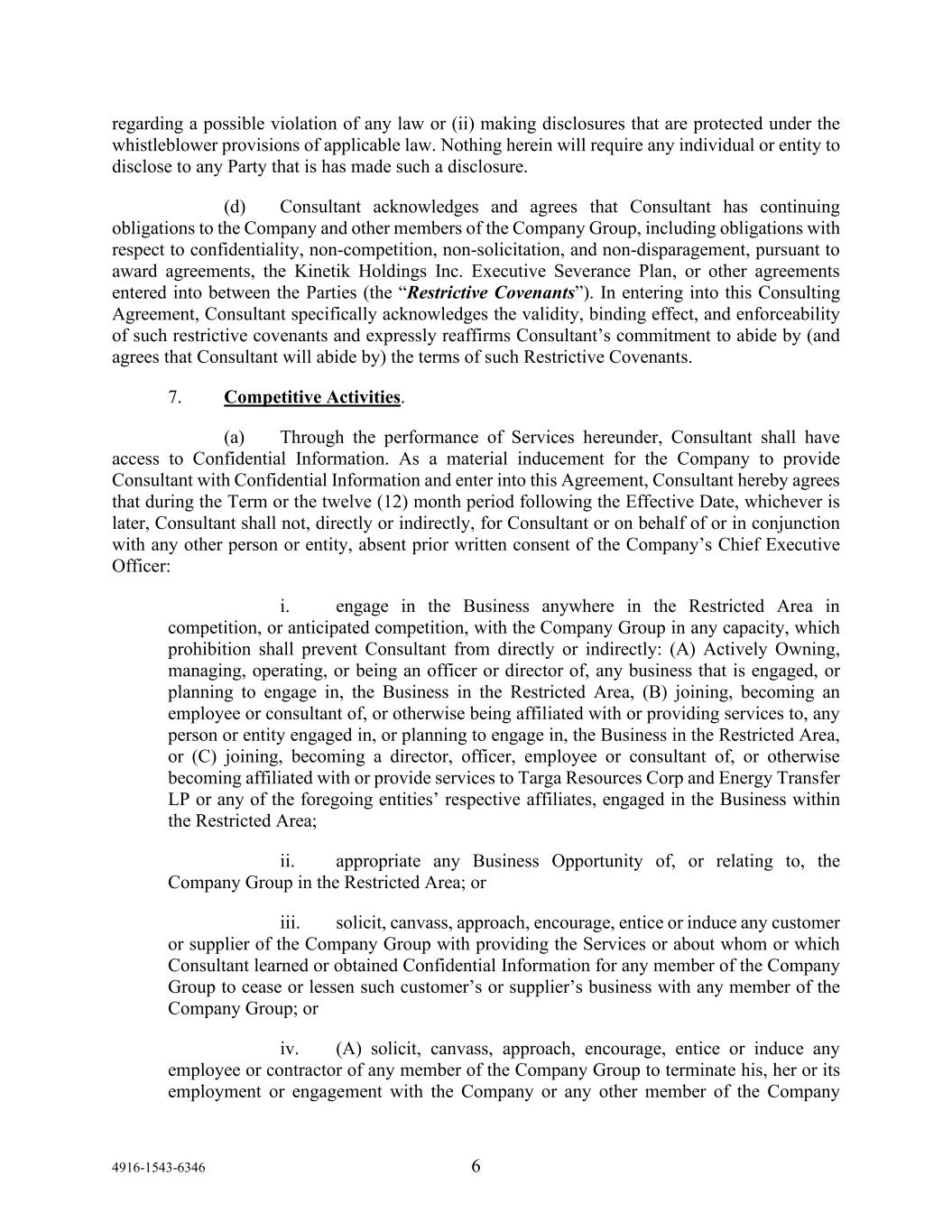 4916-1543-6346 6 regarding a possible violation of any law or (ii) making disclosures that are protected under the whistleblower provisions of applicable law. Nothing herein will require any individual or entity to disclose to any Party that is has made such a disclosure. (d) Consultant acknowledges and agrees that Consultant has continuing obligations to the Company and other members of the Company Group, including obligations with respect to confidentiality, non-competition, non-solicitation, and non-disparagement, pursuant to award agreements, the Kinetik Holdings Inc. Executive Severance Plan, or other agreements entered into between the Parties (the “Restrictive Covenants”). In entering into this Consulting Agreement, Consultant specifically acknowledges the validity, binding effect, and enforceability of such restrictive covenants and expressly reaffirms Consultant’s commitment to abide by (and agrees that Consultant will abide by) the terms of such Restrictive Covenants. 7. Competitive Activities. (a) Through the performance of Services hereunder, Consultant shall have access to Confidential Information. As a material inducement for the Company to provide Consultant with Confidential Information and enter into this Agreement, Consultant hereby agrees that during the Term or the twelve (12) month period following the Effective Date, whichever is later, Consultant shall not, directly or indirectly, for Consultant or on behalf of or in conjunction with any other person or entity, absent prior written consent of the Company’s Chief Executive Officer: i. engage in the Business anywhere in the Restricted Area in competition, or anticipated competition, with the Company Group in any capacity, which prohibition shall prevent Consultant from directly or indirectly: (A) Actively Owning, managing, operating, or being an officer or director of, any business that is engaged, or planning to engage in, the Business in the Restricted Area, (B) joining, becoming an employee or consultant of, or otherwise being affiliated with or providing services to, any person or entity engaged in, or planning to engage in, the Business in the Restricted Area, or (C) joining, becoming a director, officer, employee or consultant of, or otherwise becoming affiliated with or provide services to Targa Resources Corp and Energy Transfer LP or any of the foregoing entities’ respective affiliates, engaged in the Business within the Restricted Area; ii. appropriate any Business Opportunity of, or relating to, the Company Group in the Restricted Area; or iii. solicit, canvass, approach, encourage, entice or induce any customer or supplier of the Company Group with providing the Services or about whom or which Consultant learned or obtained Confidential Information for any member of the Company Group to cease or lessen such customer’s or supplier’s business with any member of the Company Group; or iv. (A) solicit, canvass, approach, encourage, entice or induce any employee or contractor of any member of the Company Group to terminate his, her or its employment or engagement with the Company or any other member of the Company