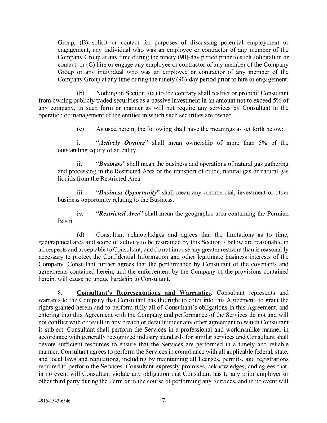 4916-1543-6346 7 Group, (B) solicit or contact for purposes of discussing potential employment or engagement, any individual who was an employee or contractor of any member of the Company Group at any time during the ninety (90)-day period prior to such solicitation or contact, or (C) hire or engage any employee or contractor of any member of the Company Group or any individual who was an employee or contractor of any member of the Company Group at any time during the ninety (90)-day period prior to hire or engagement. (b) Nothing in Section 7(a) to the contrary shall restrict or prohibit Consultant from owning publicly traded securities as a passive investment in an amount not to exceed 5% of any company, in such form or manner as will not require any services by Consultant in the operation or management of the entities in which such securities are owned. (c) As used herein, the following shall have the meanings as set forth below: i. “Actively Owning” shall mean ownership of more than 5% of the outstanding equity of an entity. ii. “Business” shall mean the business and operations of natural gas gathering and processing in the Restricted Area or the transport of crude, natural gas or natural gas liquids from the Restricted Area. iii. “Business Opportunity” shall mean any commercial, investment or other business opportunity relating to the Business. iv. “Restricted Area” shall mean the geographic area containing the Permian Basin. (d) Consultant acknowledges and agrees that the limitations as to time, geographical area and scope of activity to be restrained by this Section 7 below are reasonable in all respects and acceptable to Consultant, and do not impose any greater restraint than is reasonably necessary to protect the Confidential Information and other legitimate business interests of the Company. Consultant further agrees that the performance by Consultant of the covenants and agreements contained herein, and the enforcement by the Company of the provisions contained herein, will cause no undue hardship to Consultant. 8. Consultant’s Representations and Warranties. Consultant represents and warrants to the Company that Consultant has the right to enter into this Agreement, to grant the rights granted herein and to perform fully all of Consultant’s obligations in this Agreement, and entering into this Agreement with the Company and performance of the Services do not and will not conflict with or result in any breach or default under any other agreement to which Consultant is subject. Consultant shall perform the Services in a professional and workmanlike manner in accordance with generally recognized industry standards for similar services and Consultant shall devote sufficient resources to ensure that the Services are performed in a timely and reliable manner. Consultant agrees to perform the Services in compliance with all applicable federal, state, and local laws and regulations, including by maintaining all licenses, permits, and registrations required to perform the Services. Consultant expressly promises, acknowledges, and agrees that, in no event will Consultant violate any obligation that Consultant has to any prior employer or other third party during the Term or in the course of performing any Services, and in no event will