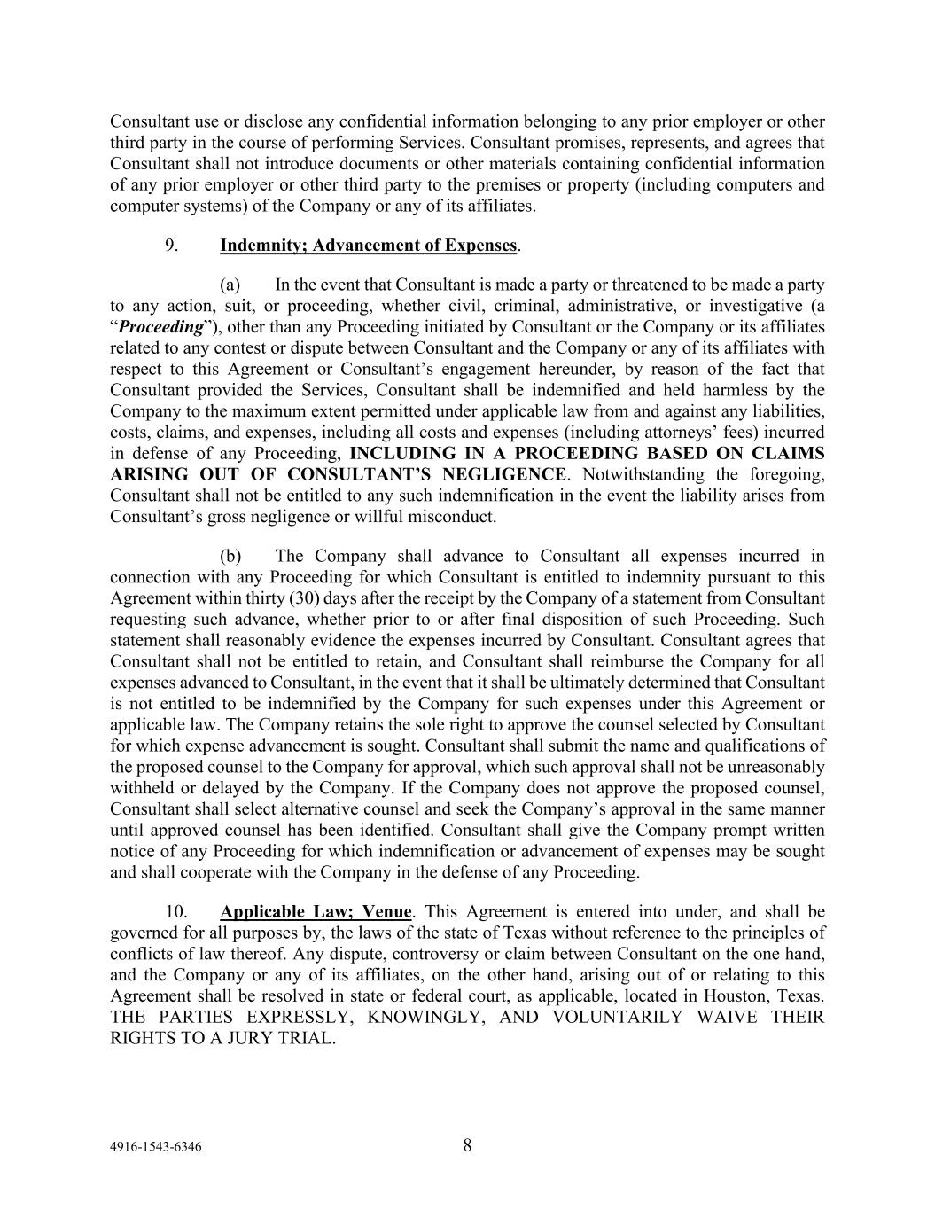 4916-1543-6346 8 Consultant use or disclose any confidential information belonging to any prior employer or other third party in the course of performing Services. Consultant promises, represents, and agrees that Consultant shall not introduce documents or other materials containing confidential information of any prior employer or other third party to the premises or property (including computers and computer systems) of the Company or any of its affiliates. 9. Indemnity; Advancement of Expenses. (a) In the event that Consultant is made a party or threatened to be made a party to any action, suit, or proceeding, whether civil, criminal, administrative, or investigative (a “Proceeding”), other than any Proceeding initiated by Consultant or the Company or its affiliates related to any contest or dispute between Consultant and the Company or any of its affiliates with respect to this Agreement or Consultant’s engagement hereunder, by reason of the fact that Consultant provided the Services, Consultant shall be indemnified and held harmless by the Company to the maximum extent permitted under applicable law from and against any liabilities, costs, claims, and expenses, including all costs and expenses (including attorneys’ fees) incurred in defense of any Proceeding, INCLUDING IN A PROCEEDING BASED ON CLAIMS ARISING OUT OF CONSULTANT’S NEGLIGENCE. Notwithstanding the foregoing, Consultant shall not be entitled to any such indemnification in the event the liability arises from Consultant’s gross negligence or willful misconduct. (b) The Company shall advance to Consultant all expenses incurred in connection with any Proceeding for which Consultant is entitled to indemnity pursuant to this Agreement within thirty (30) days after the receipt by the Company of a statement from Consultant requesting such advance, whether prior to or after final disposition of such Proceeding. Such statement shall reasonably evidence the expenses incurred by Consultant. Consultant agrees that Consultant shall not be entitled to retain, and Consultant shall reimburse the Company for all expenses advanced to Consultant, in the event that it shall be ultimately determined that Consultant is not entitled to be indemnified by the Company for such expenses under this Agreement or applicable law. The Company retains the sole right to approve the counsel selected by Consultant for which expense advancement is sought. Consultant shall submit the name and qualifications of the proposed counsel to the Company for approval, which such approval shall not be unreasonably withheld or delayed by the Company. If the Company does not approve the proposed counsel, Consultant shall select alternative counsel and seek the Company’s approval in the same manner until approved counsel has been identified. Consultant shall give the Company prompt written notice of any Proceeding for which indemnification or advancement of expenses may be sought and shall cooperate with the Company in the defense of any Proceeding. 10. Applicable Law; Venue. This Agreement is entered into under, and shall be governed for all purposes by, the laws of the state of Texas without reference to the principles of conflicts of law thereof. Any dispute, controversy or claim between Consultant on the one hand, and the Company or any of its affiliates, on the other hand, arising out of or relating to this Agreement shall be resolved in state or federal court, as applicable, located in Houston, Texas. THE PARTIES EXPRESSLY, KNOWINGLY, AND VOLUNTARILY WAIVE THEIR RIGHTS TO A JURY TRIAL.