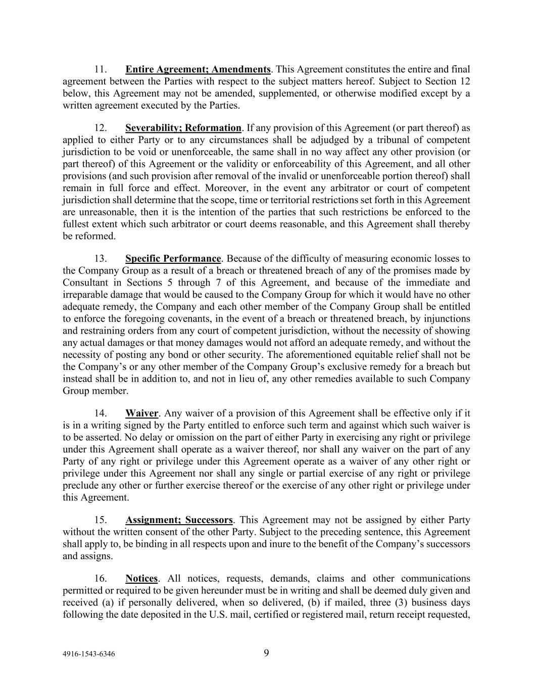 4916-1543-6346 9 11. Entire Agreement; Amendments. This Agreement constitutes the entire and final agreement between the Parties with respect to the subject matters hereof. Subject to Section 12 below, this Agreement may not be amended, supplemented, or otherwise modified except by a written agreement executed by the Parties. 12. Severability; Reformation. If any provision of this Agreement (or part thereof) as applied to either Party or to any circumstances shall be adjudged by a tribunal of competent jurisdiction to be void or unenforceable, the same shall in no way affect any other provision (or part thereof) of this Agreement or the validity or enforceability of this Agreement, and all other provisions (and such provision after removal of the invalid or unenforceable portion thereof) shall remain in full force and effect. Moreover, in the event any arbitrator or court of competent jurisdiction shall determine that the scope, time or territorial restrictions set forth in this Agreement are unreasonable, then it is the intention of the parties that such restrictions be enforced to the fullest extent which such arbitrator or court deems reasonable, and this Agreement shall thereby be reformed. 13. Specific Performance. Because of the difficulty of measuring economic losses to the Company Group as a result of a breach or threatened breach of any of the promises made by Consultant in Sections 5 through 7 of this Agreement, and because of the immediate and irreparable damage that would be caused to the Company Group for which it would have no other adequate remedy, the Company and each other member of the Company Group shall be entitled to enforce the foregoing covenants, in the event of a breach or threatened breach, by injunctions and restraining orders from any court of competent jurisdiction, without the necessity of showing any actual damages or that money damages would not afford an adequate remedy, and without the necessity of posting any bond or other security. The aforementioned equitable relief shall not be the Company’s or any other member of the Company Group’s exclusive remedy for a breach but instead shall be in addition to, and not in lieu of, any other remedies available to such Company Group member. 14. Waiver. Any waiver of a provision of this Agreement shall be effective only if it is in a writing signed by the Party entitled to enforce such term and against which such waiver is to be asserted. No delay or omission on the part of either Party in exercising any right or privilege under this Agreement shall operate as a waiver thereof, nor shall any waiver on the part of any Party of any right or privilege under this Agreement operate as a waiver of any other right or privilege under this Agreement nor shall any single or partial exercise of any right or privilege preclude any other or further exercise thereof or the exercise of any other right or privilege under this Agreement. 15. Assignment; Successors. This Agreement may not be assigned by either Party without the written consent of the other Party. Subject to the preceding sentence, this Agreement shall apply to, be binding in all respects upon and inure to the benefit of the Company’s successors and assigns. 16. Notices. All notices, requests, demands, claims and other communications permitted or required to be given hereunder must be in writing and shall be deemed duly given and received (a) if personally delivered, when so delivered, (b) if mailed, three (3) business days following the date deposited in the U.S. mail, certified or registered mail, return receipt requested,