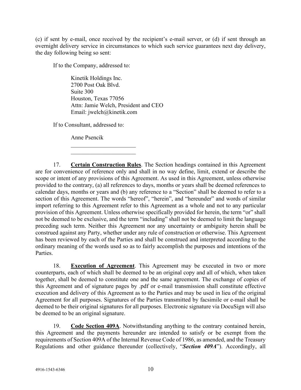 4916-1543-6346 10 (c) if sent by e-mail, once received by the recipient’s e-mail server, or (d) if sent through an overnight delivery service in circumstances to which such service guarantees next day delivery, the day following being so sent: If to the Company, addressed to: Kinetik Holdings Inc. 2700 Post Oak Blvd. Suite 300 Houston, Texas 77056 Attn: Jamie Welch, President and CEO Email: jwelch@kinetik.com If to Consultant, addressed to: Anne Psencik ______________________ ______________________ 17. Certain Construction Rules. The Section headings contained in this Agreement are for convenience of reference only and shall in no way define, limit, extend or describe the scope or intent of any provisions of this Agreement. As used in this Agreement, unless otherwise provided to the contrary, (a) all references to days, months or years shall be deemed references to calendar days, months or years and (b) any reference to a “Section” shall be deemed to refer to a section of this Agreement. The words “hereof”, “herein”, and “hereunder” and words of similar import referring to this Agreement refer to this Agreement as a whole and not to any particular provision of this Agreement. Unless otherwise specifically provided for herein, the term “or” shall not be deemed to be exclusive, and the term “including” shall not be deemed to limit the language preceding such term. Neither this Agreement nor any uncertainty or ambiguity herein shall be construed against any Party, whether under any rule of construction or otherwise. This Agreement has been reviewed by each of the Parties and shall be construed and interpreted according to the ordinary meaning of the words used so as to fairly accomplish the purposes and intentions of the Parties. 18. Execution of Agreement. This Agreement may be executed in two or more counterparts, each of which shall be deemed to be an original copy and all of which, when taken together, shall be deemed to constitute one and the same agreement. The exchange of copies of this Agreement and of signature pages by .pdf or e-mail transmission shall constitute effective execution and delivery of this Agreement as to the Parties and may be used in lieu of the original Agreement for all purposes. Signatures of the Parties transmitted by facsimile or e-mail shall be deemed to be their original signatures for all purposes. Electronic signature via DocuSign will also be deemed to be an original signature. 19. Code Section 409A. Notwithstanding anything to the contrary contained herein, this Agreement and the payments hereunder are intended to satisfy or be exempt from the requirements of Section 409A of the Internal Revenue Code of 1986, as amended, and the Treasury Regulations and other guidance thereunder (collectively, “Section 409A”). Accordingly, all
