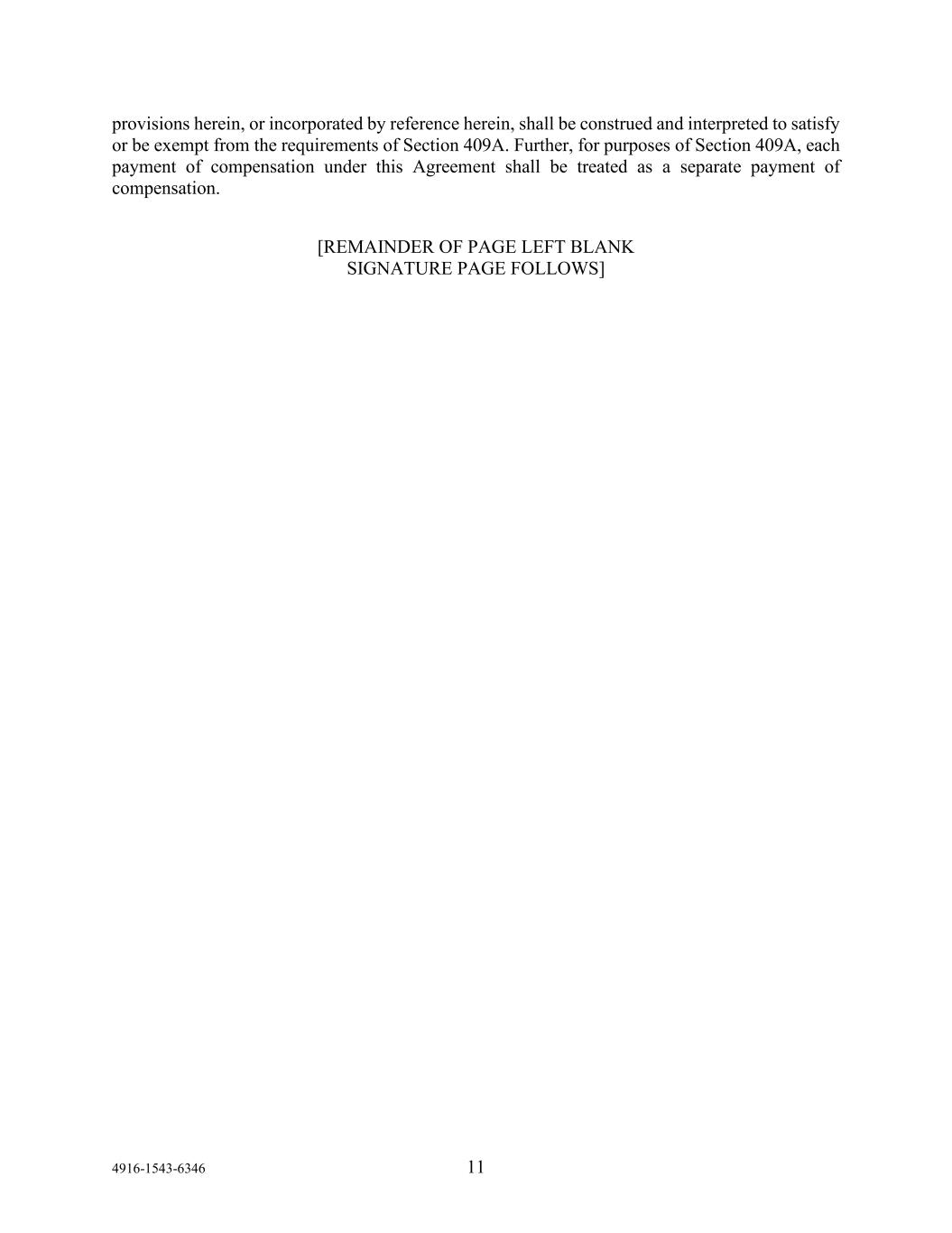 4916-1543-6346 11 provisions herein, or incorporated by reference herein, shall be construed and interpreted to satisfy or be exempt from the requirements of Section 409A. Further, for purposes of Section 409A, each payment of compensation under this Agreement shall be treated as a separate payment of compensation. [REMAINDER OF PAGE LEFT BLANK SIGNATURE PAGE FOLLOWS]