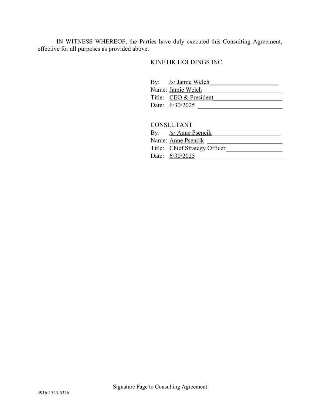 Signature Page to Consulting Agreement 4916-1543-6346 IN WITNESS WHEREOF, the Parties have duly executed this Consulting Agreement, effective for all purposes as provided above. KINETIK HOLDINGS INC. By: /s/ Jamie Welch______________________ Name: Jamie Welch _________________________ Title: CEO & President______________________ Date: 6/30/2025 ___________________________ CONSULTANT By: /s/ Anne Psencik______________________ Name: Anne Psencik ________________________ Title: Chief Strategy Officer __________________ Date: 6/30/2025 ___________________________