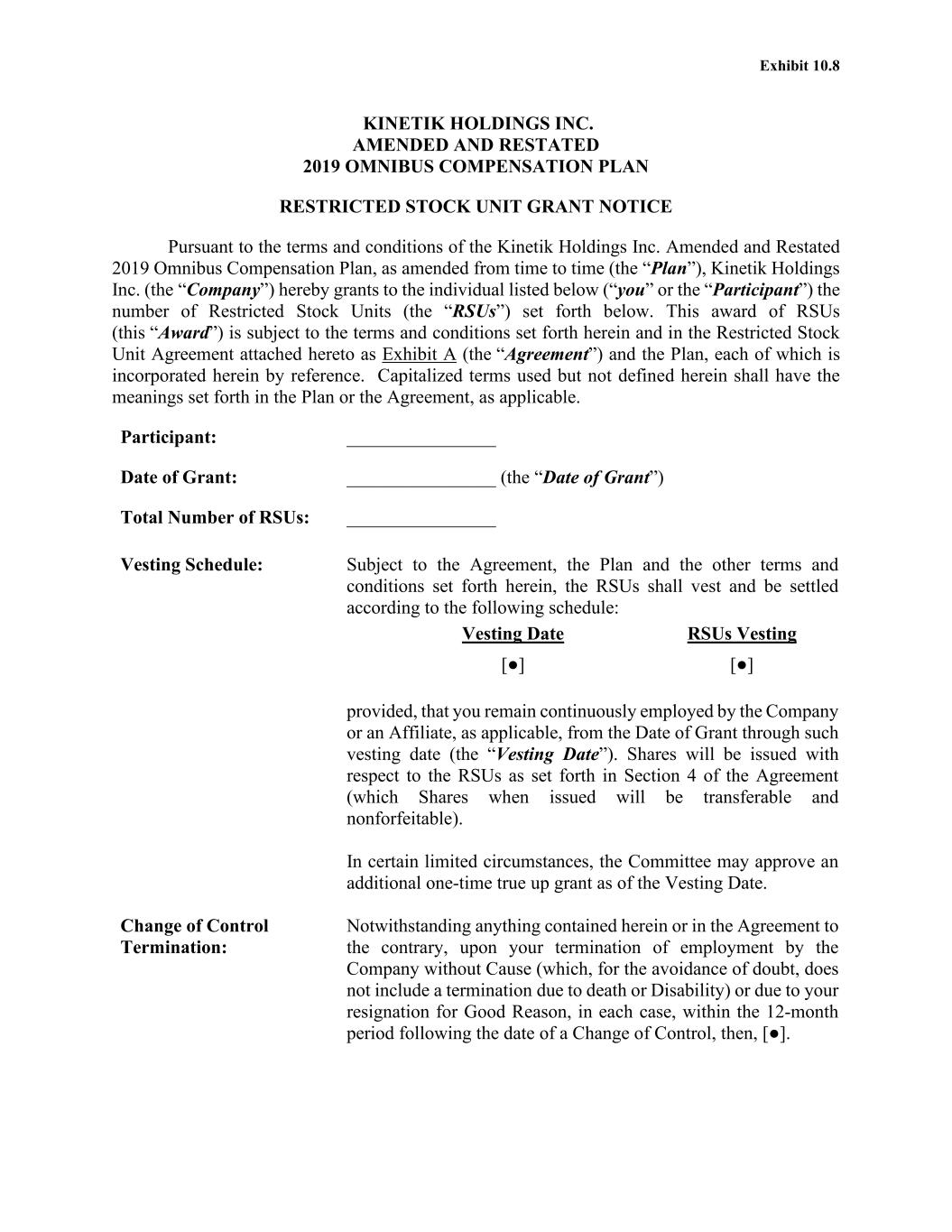 Exhibit 10.8 KINETIK HOLDINGS INC. AMENDED AND RESTATED 2019 OMNIBUS COMPENSATION PLAN RESTRICTED STOCK UNIT GRANT NOTICE Pursuant to the terms and conditions of the Kinetik Holdings Inc. Amended and Restated 2019 Omnibus Compensation Plan, as amended from time to time (the “Plan”), Kinetik Holdings Inc. (the “Company”) hereby grants to the individual listed below (“you” or the “Participant”) the number of Restricted Stock Units (the “RSUs”) set forth below. This award of RSUs (this “Award”) is subject to the terms and conditions set forth herein and in the Restricted Stock Unit Agreement attached hereto as Exhibit A (the “Agreement”) and the Plan, each of which is incorporated herein by reference. Capitalized terms used but not defined herein shall have the meanings set forth in the Plan or the Agreement, as applicable. Participant: ________________ Date of Grant: ________________ (the “Date of Grant”) Total Number of RSUs: ________________ Vesting Schedule: Subject to the Agreement, the Plan and the other terms and conditions set forth herein, the RSUs shall vest and be settled according to the following schedule: Vesting Date RSUs Vesting [●] [●] provided, that you remain continuously employed by the Company or an Affiliate, as applicable, from the Date of Grant through such vesting date (the “Vesting Date”). Shares will be issued with respect to the RSUs as set forth in Section 4 of the Agreement (which Shares when issued will be transferable and nonforfeitable). In certain limited circumstances, the Committee may approve an additional one-time true up grant as of the Vesting Date. Change of Control Termination: Notwithstanding anything contained herein or in the Agreement to the contrary, upon your termination of employment by the Company without Cause (which, for the avoidance of doubt, does not include a termination due to death or Disability) or due to your resignation for Good Reason, in each case, within the 12-month period following the date of a Change of Control, then, [●].