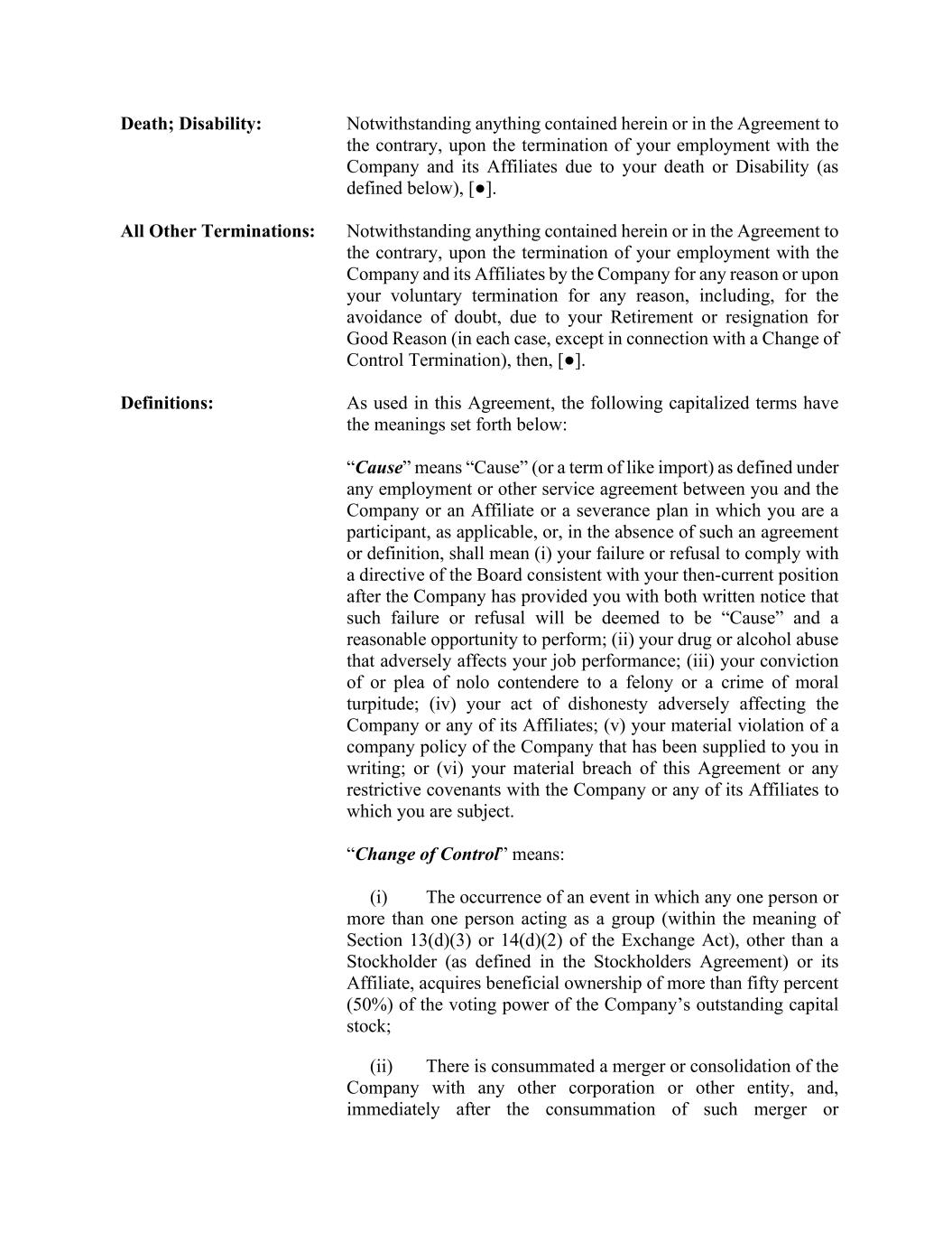 Death; Disability: Notwithstanding anything contained herein or in the Agreement to the contrary, upon the termination of your employment with the Company and its Affiliates due to your death or Disability (as defined below), [●]. All Other Terminations: Notwithstanding anything contained herein or in the Agreement to the contrary, upon the termination of your employment with the Company and its Affiliates by the Company for any reason or upon your voluntary termination for any reason, including, for the avoidance of doubt, due to your Retirement or resignation for Good Reason (in each case, except in connection with a Change of Control Termination), then, [●]. Definitions: As used in this Agreement, the following capitalized terms have the meanings set forth below: “Cause” means “Cause” (or a term of like import) as defined under any employment or other service agreement between you and the Company or an Affiliate or a severance plan in which you are a participant, as applicable, or, in the absence of such an agreement or definition, shall mean (i) your failure or refusal to comply with a directive of the Board consistent with your then-current position after the Company has provided you with both written notice that such failure or refusal will be deemed to be “Cause” and a reasonable opportunity to perform; (ii) your drug or alcohol abuse that adversely affects your job performance; (iii) your conviction of or plea of nolo contendere to a felony or a crime of moral turpitude; (iv) your act of dishonesty adversely affecting the Company or any of its Affiliates; (v) your material violation of a company policy of the Company that has been supplied to you in writing; or (vi) your material breach of this Agreement or any restrictive covenants with the Company or any of its Affiliates to which you are subject. “Change of Control” means: (i) The occurrence of an event in which any one person or more than one person acting as a group (within the meaning of Section 13(d)(3) or 14(d)(2) of the Exchange Act), other than a Stockholder (as defined in the Stockholders Agreement) or its Affiliate, acquires beneficial ownership of more than fifty percent (50%) of the voting power of the Company’s outstanding capital stock; (ii) There is consummated a merger or consolidation of the Company with any other corporation or other entity, and, immediately after the consummation of such merger or