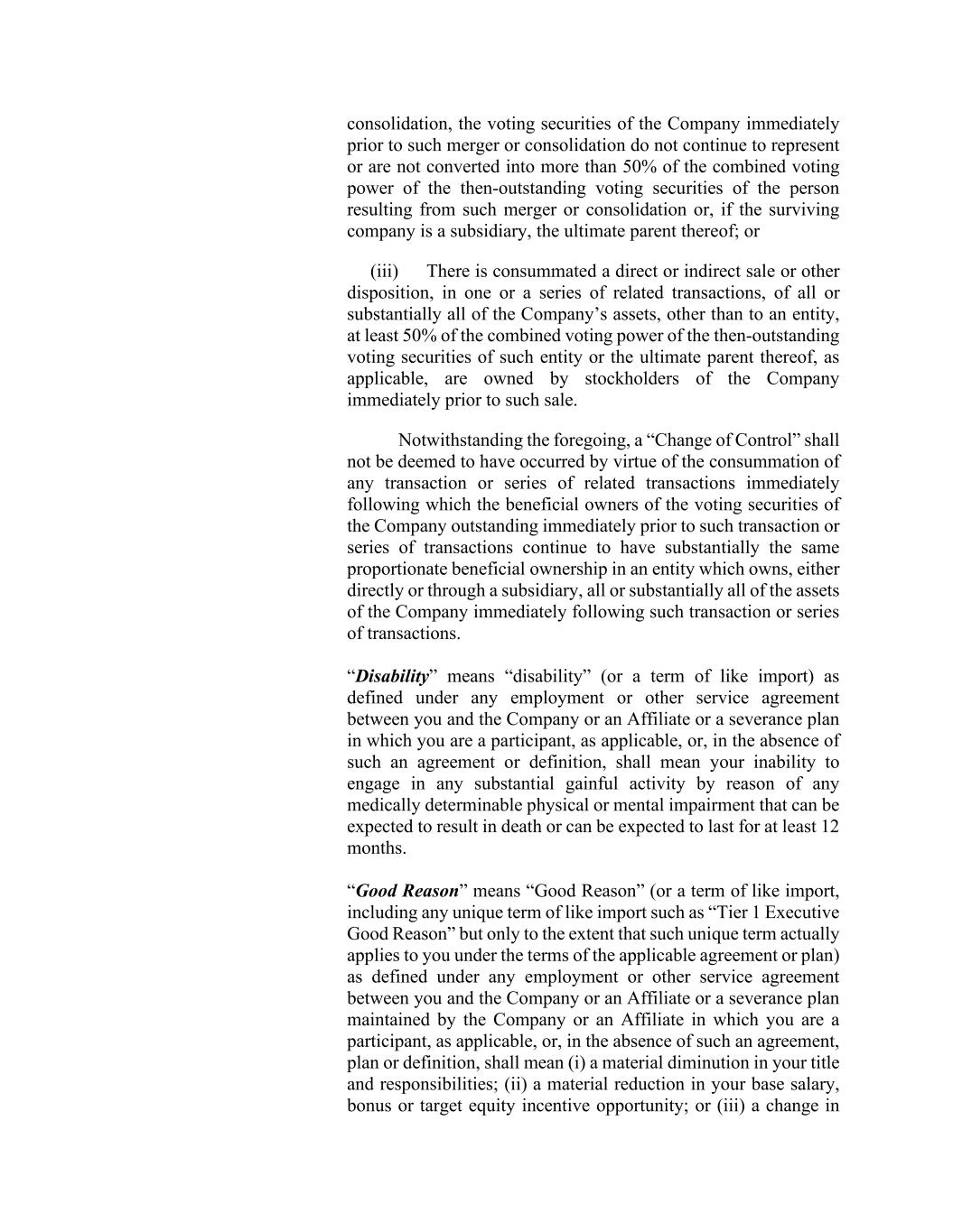 consolidation, the voting securities of the Company immediately prior to such merger or consolidation do not continue to represent or are not converted into more than 50% of the combined voting power of the then-outstanding voting securities of the person resulting from such merger or consolidation or, if the surviving company is a subsidiary, the ultimate parent thereof; or (iii) There is consummated a direct or indirect sale or other disposition, in one or a series of related transactions, of all or substantially all of the Company’s assets, other than to an entity, at least 50% of the combined voting power of the then-outstanding voting securities of such entity or the ultimate parent thereof, as applicable, are owned by stockholders of the Company immediately prior to such sale. Notwithstanding the foregoing, a “Change of Control” shall not be deemed to have occurred by virtue of the consummation of any transaction or series of related transactions immediately following which the beneficial owners of the voting securities of the Company outstanding immediately prior to such transaction or series of transactions continue to have substantially the same proportionate beneficial ownership in an entity which owns, either directly or through a subsidiary, all or substantially all of the assets of the Company immediately following such transaction or series of transactions. “Disability” means “disability” (or a term of like import) as defined under any employment or other service agreement between you and the Company or an Affiliate or a severance plan in which you are a participant, as applicable, or, in the absence of such an agreement or definition, shall mean your inability to engage in any substantial gainful activity by reason of any medically determinable physical or mental impairment that can be expected to result in death or can be expected to last for at least 12 months. “Good Reason” means “Good Reason” (or a term of like import, including any unique term of like import such as “Tier 1 Executive Good Reason” but only to the extent that such unique term actually applies to you under the terms of the applicable agreement or plan) as defined under any employment or other service agreement between you and the Company or an Affiliate or a severance plan maintained by the Company or an Affiliate in which you are a participant, as applicable, or, in the absence of such an agreement, plan or definition, shall mean (i) a material diminution in your title and responsibilities; (ii) a material reduction in your base salary, bonus or target equity incentive opportunity; or (iii) a change in