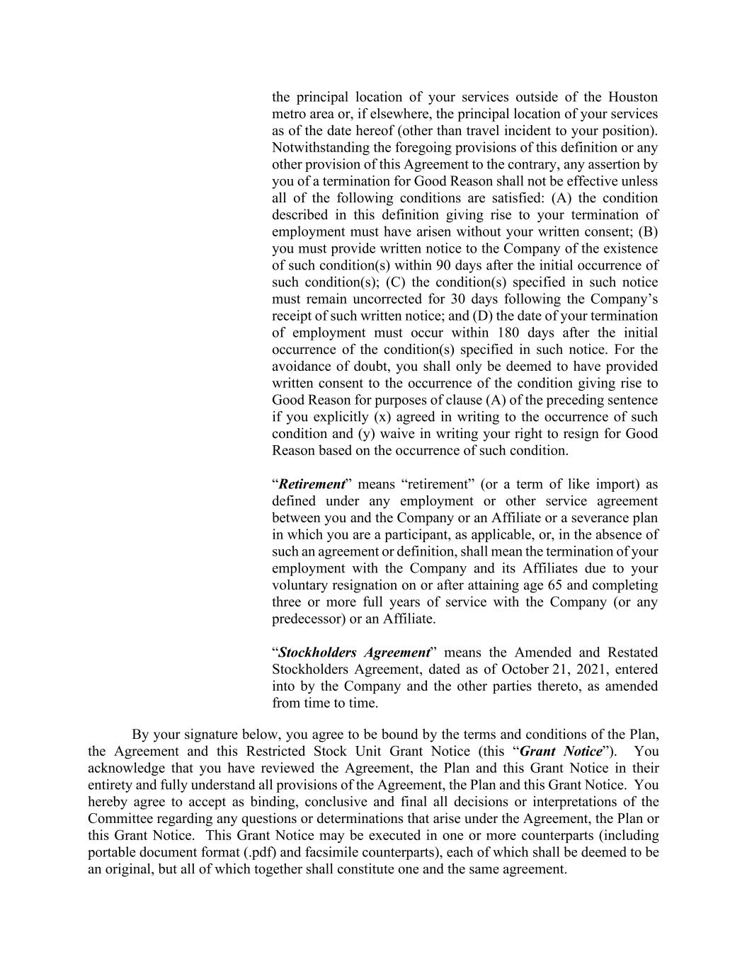 the principal location of your services outside of the Houston metro area or, if elsewhere, the principal location of your services as of the date hereof (other than travel incident to your position). Notwithstanding the foregoing provisions of this definition or any other provision of this Agreement to the contrary, any assertion by you of a termination for Good Reason shall not be effective unless all of the following conditions are satisfied: (A) the condition described in this definition giving rise to your termination of employment must have arisen without your written consent; (B) you must provide written notice to the Company of the existence of such condition(s) within 90 days after the initial occurrence of such condition(s); (C) the condition(s) specified in such notice must remain uncorrected for 30 days following the Company’s receipt of such written notice; and (D) the date of your termination of employment must occur within 180 days after the initial occurrence of the condition(s) specified in such notice. For the avoidance of doubt, you shall only be deemed to have provided written consent to the occurrence of the condition giving rise to Good Reason for purposes of clause (A) of the preceding sentence if you explicitly (x) agreed in writing to the occurrence of such condition and (y) waive in writing your right to resign for Good Reason based on the occurrence of such condition. “Retirement” means “retirement” (or a term of like import) as defined under any employment or other service agreement between you and the Company or an Affiliate or a severance plan in which you are a participant, as applicable, or, in the absence of such an agreement or definition, shall mean the termination of your employment with the Company and its Affiliates due to your voluntary resignation on or after attaining age 65 and completing three or more full years of service with the Company (or any predecessor) or an Affiliate. “Stockholders Agreement” means the Amended and Restated Stockholders Agreement, dated as of October 21, 2021, entered into by the Company and the other parties thereto, as amended from time to time. By your signature below, you agree to be bound by the terms and conditions of the Plan, the Agreement and this Restricted Stock Unit Grant Notice (this “Grant Notice”). You acknowledge that you have reviewed the Agreement, the Plan and this Grant Notice in their entirety and fully understand all provisions of the Agreement, the Plan and this Grant Notice. You hereby agree to accept as binding, conclusive and final all decisions or interpretations of the Committee regarding any questions or determinations that arise under the Agreement, the Plan or this Grant Notice. This Grant Notice may be executed in one or more counterparts (including portable document format (.pdf) and facsimile counterparts), each of which shall be deemed to be an original, but all of which together shall constitute one and the same agreement.