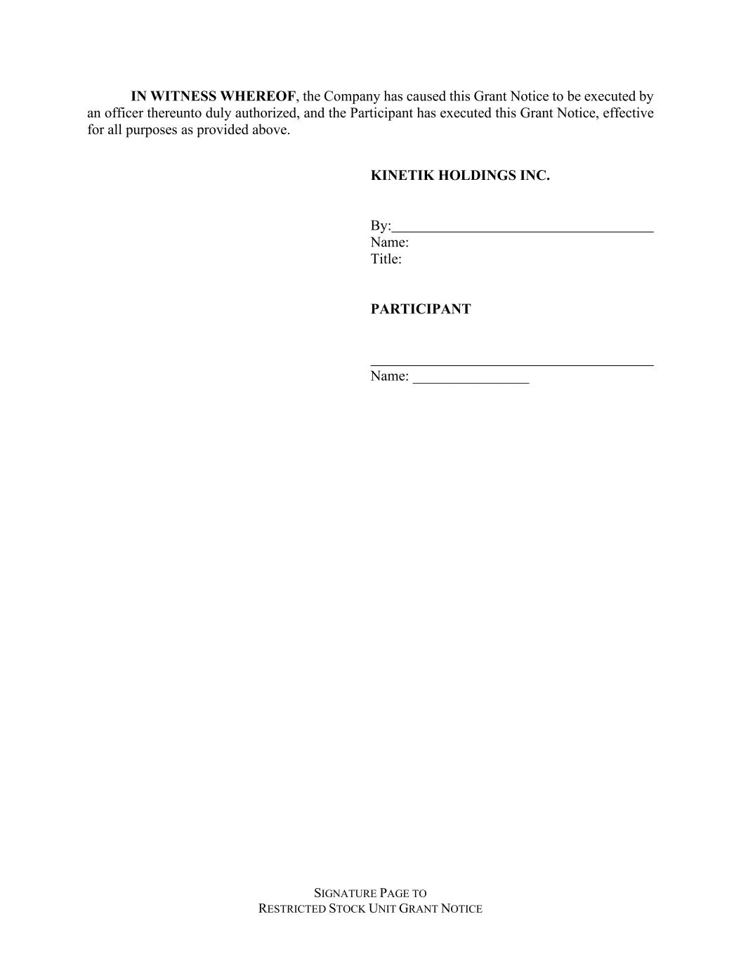 SIGNATURE PAGE TO RESTRICTED STOCK UNIT GRANT NOTICE IN WITNESS WHEREOF, the Company has caused this Grant Notice to be executed by an officer thereunto duly authorized, and the Participant has executed this Grant Notice, effective for all purposes as provided above. KINETIK HOLDINGS INC. By: Name: Title: PARTICIPANT Name: ________________