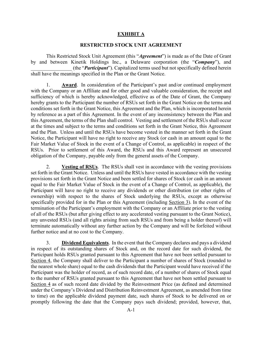 A-1 EXHIBIT A RESTRICTED STOCK UNIT AGREEMENT This Restricted Stock Unit Agreement (this “Agreement”) is made as of the Date of Grant by and between Kinetik Holdings Inc., a Delaware corporation (the “Company”), and ________________ (the “Participant”). Capitalized terms used but not specifically defined herein shall have the meanings specified in the Plan or the Grant Notice. 1. Award. In consideration of the Participant’s past and/or continued employment with the Company or an Affiliate and for other good and valuable consideration, the receipt and sufficiency of which is hereby acknowledged, effective as of the Date of Grant, the Company hereby grants to the Participant the number of RSUs set forth in the Grant Notice on the terms and conditions set forth in the Grant Notice, this Agreement and the Plan, which is incorporated herein by reference as a part of this Agreement. In the event of any inconsistency between the Plan and this Agreement, the terms of the Plan shall control. Vesting and settlement of the RSUs shall occur at the times and subject to the terms and conditions set forth in the Grant Notice, this Agreement and the Plan. Unless and until the RSUs have become vested in the manner set forth in the Grant Notice, the Participant will have no right to receive any Stock (or cash in an amount equal to the Fair Market Value of Stock in the event of a Change of Control, as applicable) in respect of the RSUs. Prior to settlement of this Award, the RSUs and this Award represent an unsecured obligation of the Company, payable only from the general assets of the Company. 2. Vesting of RSUs. The RSUs shall vest in accordance with the vesting provisions set forth in the Grant Notice. Unless and until the RSUs have vested in accordance with the vesting provisions set forth in the Grant Notice and been settled for shares of Stock (or cash in an amount equal to the Fair Market Value of Stock in the event of a Change of Control, as applicable), the Participant will have no right to receive any dividends or other distribution (or other rights of ownership) with respect to the shares of Stock underlying the RSUs, except as otherwise specifically provided for in the Plan or this Agreement (including Section 3). In the event of the termination of the Participant’s employment with the Company or an Affiliate prior to the vesting of all of the RSUs (but after giving effect to any accelerated vesting pursuant to the Grant Notice), any unvested RSUs (and all rights arising from such RSUs and from being a holder thereof) will terminate automatically without any further action by the Company and will be forfeited without further notice and at no cost to the Company. 3. Dividend Equivalents. In the event that the Company declares and pays a dividend in respect of its outstanding shares of Stock and, on the record date for such dividend, the Participant holds RSUs granted pursuant to this Agreement that have not been settled pursuant to Section 4, the Company shall deliver to the Participant a number of shares of Stock (rounded to the nearest whole share) equal to the cash dividends that the Participant would have received if the Participant was the holder of record, as of such record date, of a number of shares of Stock equal to the number of RSUs granted pursuant to this Agreement that have not been settled pursuant to Section 4 as of such record date divided by the Reinvestment Price (as defined and determined under the Company’s Dividend and Distribution Reinvestment Agreement, as amended from time to time) on the applicable dividend payment date, such shares of Stock to be delivered on or promptly following the date that the Company pays such dividend; provided, however, that,