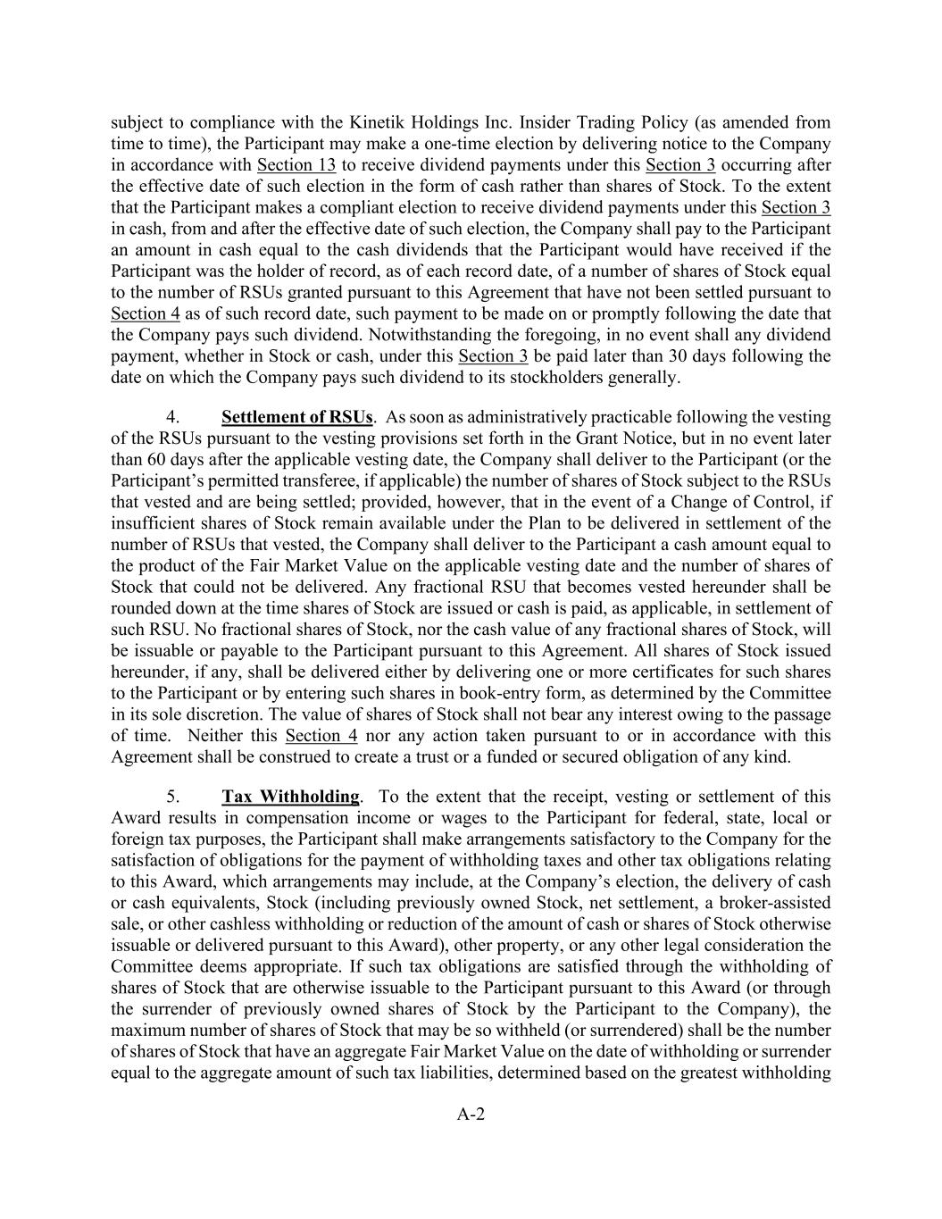 A-2 subject to compliance with the Kinetik Holdings Inc. Insider Trading Policy (as amended from time to time), the Participant may make a one-time election by delivering notice to the Company in accordance with Section 13 to receive dividend payments under this Section 3 occurring after the effective date of such election in the form of cash rather than shares of Stock. To the extent that the Participant makes a compliant election to receive dividend payments under this Section 3 in cash, from and after the effective date of such election, the Company shall pay to the Participant an amount in cash equal to the cash dividends that the Participant would have received if the Participant was the holder of record, as of each record date, of a number of shares of Stock equal to the number of RSUs granted pursuant to this Agreement that have not been settled pursuant to Section 4 as of such record date, such payment to be made on or promptly following the date that the Company pays such dividend. Notwithstanding the foregoing, in no event shall any dividend payment, whether in Stock or cash, under this Section 3 be paid later than 30 days following the date on which the Company pays such dividend to its stockholders generally. 4. Settlement of RSUs. As soon as administratively practicable following the vesting of the RSUs pursuant to the vesting provisions set forth in the Grant Notice, but in no event later than 60 days after the applicable vesting date, the Company shall deliver to the Participant (or the Participant’s permitted transferee, if applicable) the number of shares of Stock subject to the RSUs that vested and are being settled; provided, however, that in the event of a Change of Control, if insufficient shares of Stock remain available under the Plan to be delivered in settlement of the number of RSUs that vested, the Company shall deliver to the Participant a cash amount equal to the product of the Fair Market Value on the applicable vesting date and the number of shares of Stock that could not be delivered. Any fractional RSU that becomes vested hereunder shall be rounded down at the time shares of Stock are issued or cash is paid, as applicable, in settlement of such RSU. No fractional shares of Stock, nor the cash value of any fractional shares of Stock, will be issuable or payable to the Participant pursuant to this Agreement. All shares of Stock issued hereunder, if any, shall be delivered either by delivering one or more certificates for such shares to the Participant or by entering such shares in book-entry form, as determined by the Committee in its sole discretion. The value of shares of Stock shall not bear any interest owing to the passage of time. Neither this Section 4 nor any action taken pursuant to or in accordance with this Agreement shall be construed to create a trust or a funded or secured obligation of any kind. 5. Tax Withholding. To the extent that the receipt, vesting or settlement of this Award results in compensation income or wages to the Participant for federal, state, local or foreign tax purposes, the Participant shall make arrangements satisfactory to the Company for the satisfaction of obligations for the payment of withholding taxes and other tax obligations relating to this Award, which arrangements may include, at the Company’s election, the delivery of cash or cash equivalents, Stock (including previously owned Stock, net settlement, a broker-assisted sale, or other cashless withholding or reduction of the amount of cash or shares of Stock otherwise issuable or delivered pursuant to this Award), other property, or any other legal consideration the Committee deems appropriate. If such tax obligations are satisfied through the withholding of shares of Stock that are otherwise issuable to the Participant pursuant to this Award (or through the surrender of previously owned shares of Stock by the Participant to the Company), the maximum number of shares of Stock that may be so withheld (or surrendered) shall be the number of shares of Stock that have an aggregate Fair Market Value on the date of withholding or surrender equal to the aggregate amount of such tax liabilities, determined based on the greatest withholding