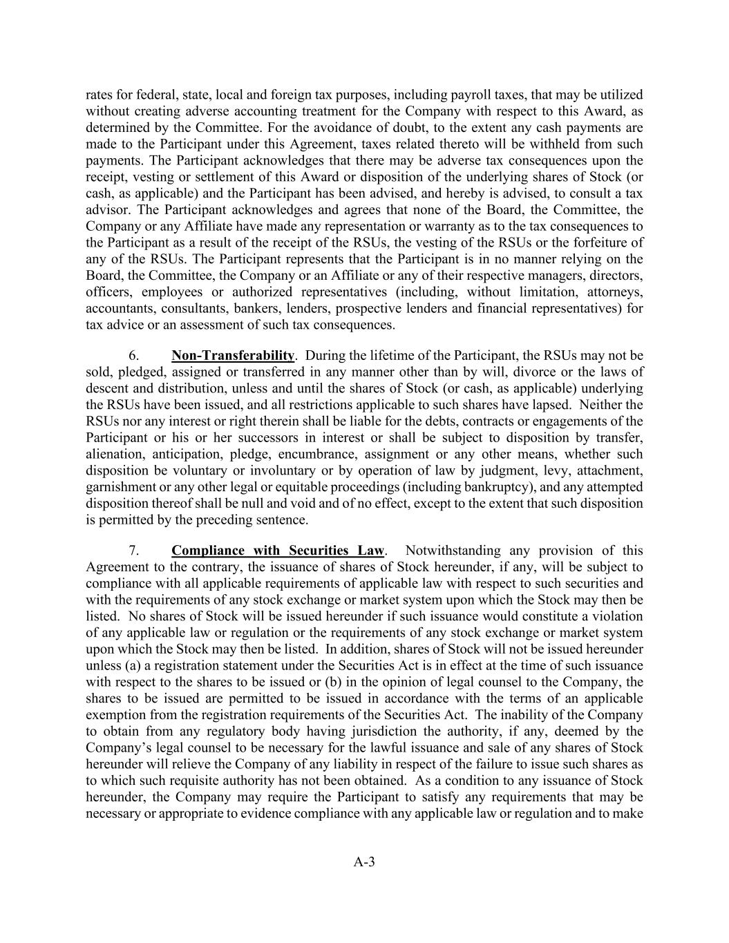 A-3 rates for federal, state, local and foreign tax purposes, including payroll taxes, that may be utilized without creating adverse accounting treatment for the Company with respect to this Award, as determined by the Committee. For the avoidance of doubt, to the extent any cash payments are made to the Participant under this Agreement, taxes related thereto will be withheld from such payments. The Participant acknowledges that there may be adverse tax consequences upon the receipt, vesting or settlement of this Award or disposition of the underlying shares of Stock (or cash, as applicable) and the Participant has been advised, and hereby is advised, to consult a tax advisor. The Participant acknowledges and agrees that none of the Board, the Committee, the Company or any Affiliate have made any representation or warranty as to the tax consequences to the Participant as a result of the receipt of the RSUs, the vesting of the RSUs or the forfeiture of any of the RSUs. The Participant represents that the Participant is in no manner relying on the Board, the Committee, the Company or an Affiliate or any of their respective managers, directors, officers, employees or authorized representatives (including, without limitation, attorneys, accountants, consultants, bankers, lenders, prospective lenders and financial representatives) for tax advice or an assessment of such tax consequences. 6. Non-Transferability. During the lifetime of the Participant, the RSUs may not be sold, pledged, assigned or transferred in any manner other than by will, divorce or the laws of descent and distribution, unless and until the shares of Stock (or cash, as applicable) underlying the RSUs have been issued, and all restrictions applicable to such shares have lapsed. Neither the RSUs nor any interest or right therein shall be liable for the debts, contracts or engagements of the Participant or his or her successors in interest or shall be subject to disposition by transfer, alienation, anticipation, pledge, encumbrance, assignment or any other means, whether such disposition be voluntary or involuntary or by operation of law by judgment, levy, attachment, garnishment or any other legal or equitable proceedings (including bankruptcy), and any attempted disposition thereof shall be null and void and of no effect, except to the extent that such disposition is permitted by the preceding sentence. 7. Compliance with Securities Law. Notwithstanding any provision of this Agreement to the contrary, the issuance of shares of Stock hereunder, if any, will be subject to compliance with all applicable requirements of applicable law with respect to such securities and with the requirements of any stock exchange or market system upon which the Stock may then be listed. No shares of Stock will be issued hereunder if such issuance would constitute a violation of any applicable law or regulation or the requirements of any stock exchange or market system upon which the Stock may then be listed. In addition, shares of Stock will not be issued hereunder unless (a) a registration statement under the Securities Act is in effect at the time of such issuance with respect to the shares to be issued or (b) in the opinion of legal counsel to the Company, the shares to be issued are permitted to be issued in accordance with the terms of an applicable exemption from the registration requirements of the Securities Act. The inability of the Company to obtain from any regulatory body having jurisdiction the authority, if any, deemed by the Company’s legal counsel to be necessary for the lawful issuance and sale of any shares of Stock hereunder will relieve the Company of any liability in respect of the failure to issue such shares as to which such requisite authority has not been obtained. As a condition to any issuance of Stock hereunder, the Company may require the Participant to satisfy any requirements that may be necessary or appropriate to evidence compliance with any applicable law or regulation and to make