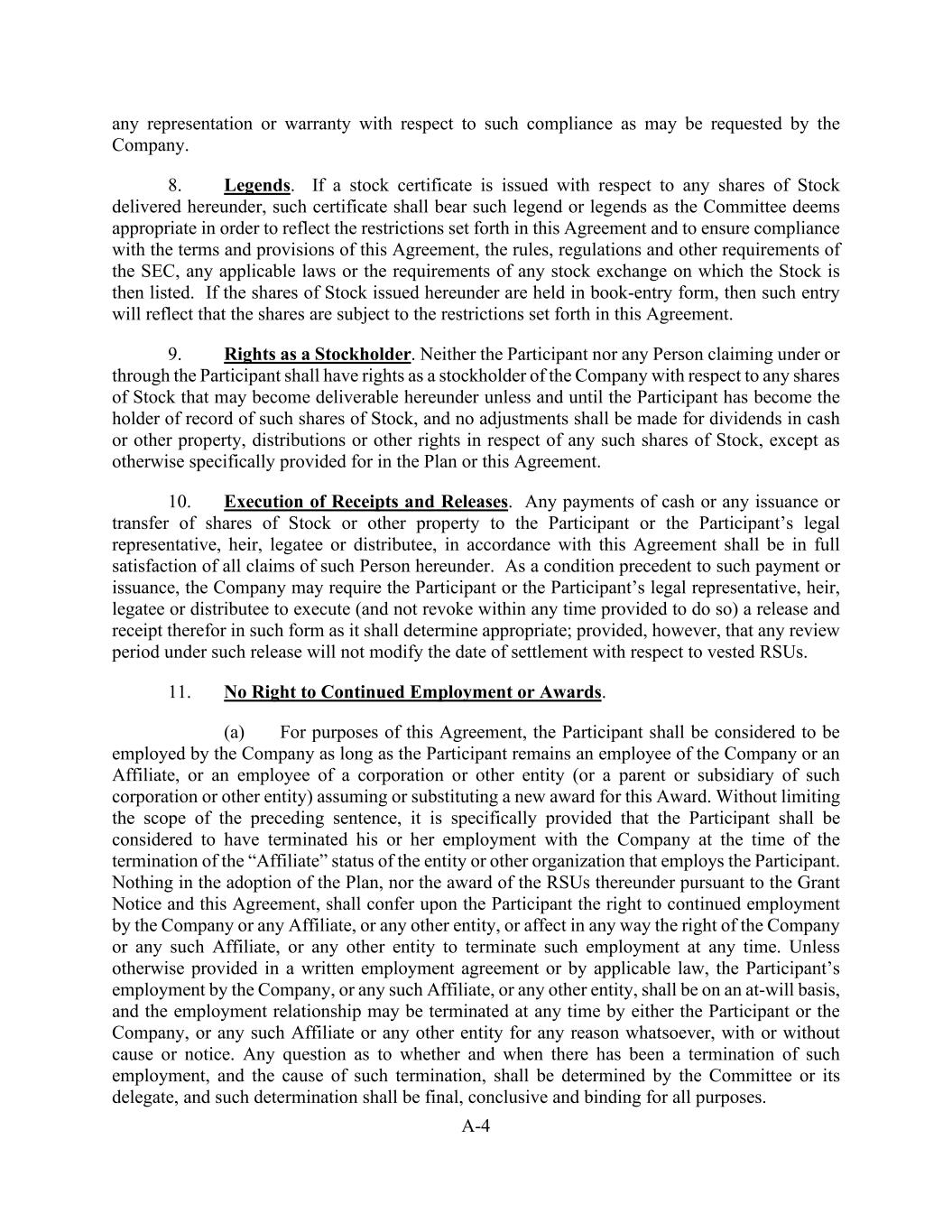 A-4 any representation or warranty with respect to such compliance as may be requested by the Company. 8. Legends. If a stock certificate is issued with respect to any shares of Stock delivered hereunder, such certificate shall bear such legend or legends as the Committee deems appropriate in order to reflect the restrictions set forth in this Agreement and to ensure compliance with the terms and provisions of this Agreement, the rules, regulations and other requirements of the SEC, any applicable laws or the requirements of any stock exchange on which the Stock is then listed. If the shares of Stock issued hereunder are held in book-entry form, then such entry will reflect that the shares are subject to the restrictions set forth in this Agreement. 9. Rights as a Stockholder. Neither the Participant nor any Person claiming under or through the Participant shall have rights as a stockholder of the Company with respect to any shares of Stock that may become deliverable hereunder unless and until the Participant has become the holder of record of such shares of Stock, and no adjustments shall be made for dividends in cash or other property, distributions or other rights in respect of any such shares of Stock, except as otherwise specifically provided for in the Plan or this Agreement. 10. Execution of Receipts and Releases. Any payments of cash or any issuance or transfer of shares of Stock or other property to the Participant or the Participant’s legal representative, heir, legatee or distributee, in accordance with this Agreement shall be in full satisfaction of all claims of such Person hereunder. As a condition precedent to such payment or issuance, the Company may require the Participant or the Participant’s legal representative, heir, legatee or distributee to execute (and not revoke within any time provided to do so) a release and receipt therefor in such form as it shall determine appropriate; provided, however, that any review period under such release will not modify the date of settlement with respect to vested RSUs. 11. No Right to Continued Employment or Awards. (a) For purposes of this Agreement, the Participant shall be considered to be employed by the Company as long as the Participant remains an employee of the Company or an Affiliate, or an employee of a corporation or other entity (or a parent or subsidiary of such corporation or other entity) assuming or substituting a new award for this Award. Without limiting the scope of the preceding sentence, it is specifically provided that the Participant shall be considered to have terminated his or her employment with the Company at the time of the termination of the “Affiliate” status of the entity or other organization that employs the Participant. Nothing in the adoption of the Plan, nor the award of the RSUs thereunder pursuant to the Grant Notice and this Agreement, shall confer upon the Participant the right to continued employment by the Company or any Affiliate, or any other entity, or affect in any way the right of the Company or any such Affiliate, or any other entity to terminate such employment at any time. Unless otherwise provided in a written employment agreement or by applicable law, the Participant’s employment by the Company, or any such Affiliate, or any other entity, shall be on an at-will basis, and the employment relationship may be terminated at any time by either the Participant or the Company, or any such Affiliate or any other entity for any reason whatsoever, with or without cause or notice. Any question as to whether and when there has been a termination of such employment, and the cause of such termination, shall be determined by the Committee or its delegate, and such determination shall be final, conclusive and binding for all purposes.