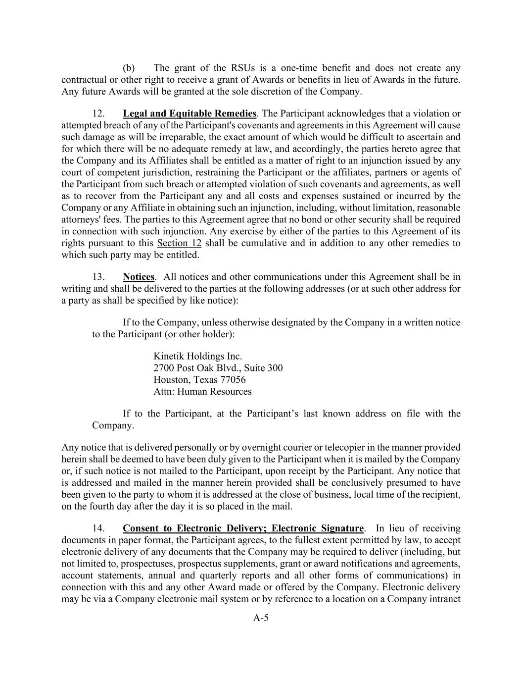 A-5 (b) The grant of the RSUs is a one-time benefit and does not create any contractual or other right to receive a grant of Awards or benefits in lieu of Awards in the future. Any future Awards will be granted at the sole discretion of the Company. 12. Legal and Equitable Remedies. The Participant acknowledges that a violation or attempted breach of any of the Participant's covenants and agreements in this Agreement will cause such damage as will be irreparable, the exact amount of which would be difficult to ascertain and for which there will be no adequate remedy at law, and accordingly, the parties hereto agree that the Company and its Affiliates shall be entitled as a matter of right to an injunction issued by any court of competent jurisdiction, restraining the Participant or the affiliates, partners or agents of the Participant from such breach or attempted violation of such covenants and agreements, as well as to recover from the Participant any and all costs and expenses sustained or incurred by the Company or any Affiliate in obtaining such an injunction, including, without limitation, reasonable attorneys' fees. The parties to this Agreement agree that no bond or other security shall be required in connection with such injunction. Any exercise by either of the parties to this Agreement of its rights pursuant to this Section 12 shall be cumulative and in addition to any other remedies to which such party may be entitled. 13. Notices. All notices and other communications under this Agreement shall be in writing and shall be delivered to the parties at the following addresses (or at such other address for a party as shall be specified by like notice): If to the Company, unless otherwise designated by the Company in a written notice to the Participant (or other holder): Kinetik Holdings Inc. 2700 Post Oak Blvd., Suite 300 Houston, Texas 77056 Attn: Human Resources If to the Participant, at the Participant’s last known address on file with the Company. Any notice that is delivered personally or by overnight courier or telecopier in the manner provided herein shall be deemed to have been duly given to the Participant when it is mailed by the Company or, if such notice is not mailed to the Participant, upon receipt by the Participant. Any notice that is addressed and mailed in the manner herein provided shall be conclusively presumed to have been given to the party to whom it is addressed at the close of business, local time of the recipient, on the fourth day after the day it is so placed in the mail. 14. Consent to Electronic Delivery; Electronic Signature. In lieu of receiving documents in paper format, the Participant agrees, to the fullest extent permitted by law, to accept electronic delivery of any documents that the Company may be required to deliver (including, but not limited to, prospectuses, prospectus supplements, grant or award notifications and agreements, account statements, annual and quarterly reports and all other forms of communications) in connection with this and any other Award made or offered by the Company. Electronic delivery may be via a Company electronic mail system or by reference to a location on a Company intranet