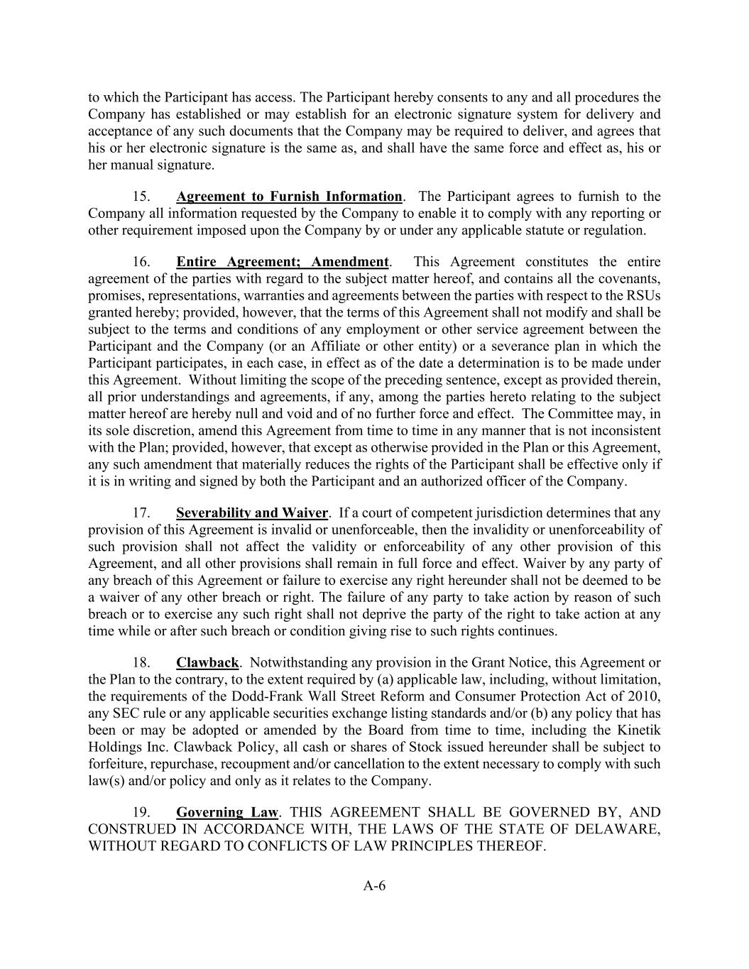 A-6 to which the Participant has access. The Participant hereby consents to any and all procedures the Company has established or may establish for an electronic signature system for delivery and acceptance of any such documents that the Company may be required to deliver, and agrees that his or her electronic signature is the same as, and shall have the same force and effect as, his or her manual signature. 15. Agreement to Furnish Information. The Participant agrees to furnish to the Company all information requested by the Company to enable it to comply with any reporting or other requirement imposed upon the Company by or under any applicable statute or regulation. 16. Entire Agreement; Amendment. This Agreement constitutes the entire agreement of the parties with regard to the subject matter hereof, and contains all the covenants, promises, representations, warranties and agreements between the parties with respect to the RSUs granted hereby; provided, however, that the terms of this Agreement shall not modify and shall be subject to the terms and conditions of any employment or other service agreement between the Participant and the Company (or an Affiliate or other entity) or a severance plan in which the Participant participates, in each case, in effect as of the date a determination is to be made under this Agreement. Without limiting the scope of the preceding sentence, except as provided therein, all prior understandings and agreements, if any, among the parties hereto relating to the subject matter hereof are hereby null and void and of no further force and effect. The Committee may, in its sole discretion, amend this Agreement from time to time in any manner that is not inconsistent with the Plan; provided, however, that except as otherwise provided in the Plan or this Agreement, any such amendment that materially reduces the rights of the Participant shall be effective only if it is in writing and signed by both the Participant and an authorized officer of the Company. 17. Severability and Waiver. If a court of competent jurisdiction determines that any provision of this Agreement is invalid or unenforceable, then the invalidity or unenforceability of such provision shall not affect the validity or enforceability of any other provision of this Agreement, and all other provisions shall remain in full force and effect. Waiver by any party of any breach of this Agreement or failure to exercise any right hereunder shall not be deemed to be a waiver of any other breach or right. The failure of any party to take action by reason of such breach or to exercise any such right shall not deprive the party of the right to take action at any time while or after such breach or condition giving rise to such rights continues. 18. Clawback. Notwithstanding any provision in the Grant Notice, this Agreement or the Plan to the contrary, to the extent required by (a) applicable law, including, without limitation, the requirements of the Dodd-Frank Wall Street Reform and Consumer Protection Act of 2010, any SEC rule or any applicable securities exchange listing standards and/or (b) any policy that has been or may be adopted or amended by the Board from time to time, including the Kinetik Holdings Inc. Clawback Policy, all cash or shares of Stock issued hereunder shall be subject to forfeiture, repurchase, recoupment and/or cancellation to the extent necessary to comply with such law(s) and/or policy and only as it relates to the Company. 19. Governing Law. THIS AGREEMENT SHALL BE GOVERNED BY, AND CONSTRUED IN ACCORDANCE WITH, THE LAWS OF THE STATE OF DELAWARE, WITHOUT REGARD TO CONFLICTS OF LAW PRINCIPLES THEREOF.