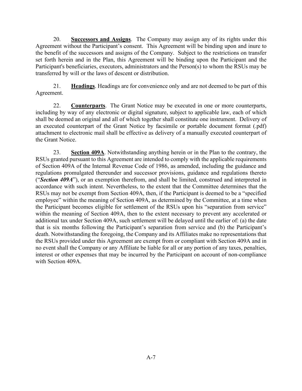 A-7 20. Successors and Assigns. The Company may assign any of its rights under this Agreement without the Participant’s consent. This Agreement will be binding upon and inure to the benefit of the successors and assigns of the Company. Subject to the restrictions on transfer set forth herein and in the Plan, this Agreement will be binding upon the Participant and the Participant's beneficiaries, executors, administrators and the Person(s) to whom the RSUs may be transferred by will or the laws of descent or distribution. 21. Headings. Headings are for convenience only and are not deemed to be part of this Agreement. 22. Counterparts. The Grant Notice may be executed in one or more counterparts, including by way of any electronic or digital signature, subject to applicable law, each of which shall be deemed an original and all of which together shall constitute one instrument. Delivery of an executed counterpart of the Grant Notice by facsimile or portable document format (.pdf) attachment to electronic mail shall be effective as delivery of a manually executed counterpart of the Grant Notice. 23. Section 409A. Notwithstanding anything herein or in the Plan to the contrary, the RSUs granted pursuant to this Agreement are intended to comply with the applicable requirements of Section 409A of the Internal Revenue Code of 1986, as amended, including the guidance and regulations promulgated thereunder and successor provisions, guidance and regulations thereto (“Section 409A”), or an exemption therefrom, and shall be limited, construed and interpreted in accordance with such intent. Nevertheless, to the extent that the Committee determines that the RSUs may not be exempt from Section 409A, then, if the Participant is deemed to be a “specified employee” within the meaning of Section 409A, as determined by the Committee, at a time when the Participant becomes eligible for settlement of the RSUs upon his “separation from service” within the meaning of Section 409A, then to the extent necessary to prevent any accelerated or additional tax under Section 409A, such settlement will be delayed until the earlier of: (a) the date that is six months following the Participant’s separation from service and (b) the Participant’s death. Notwithstanding the foregoing, the Company and its Affiliates make no representations that the RSUs provided under this Agreement are exempt from or compliant with Section 409A and in no event shall the Company or any Affiliate be liable for all or any portion of any taxes, penalties, interest or other expenses that may be incurred by the Participant on account of non-compliance with Section 409A.