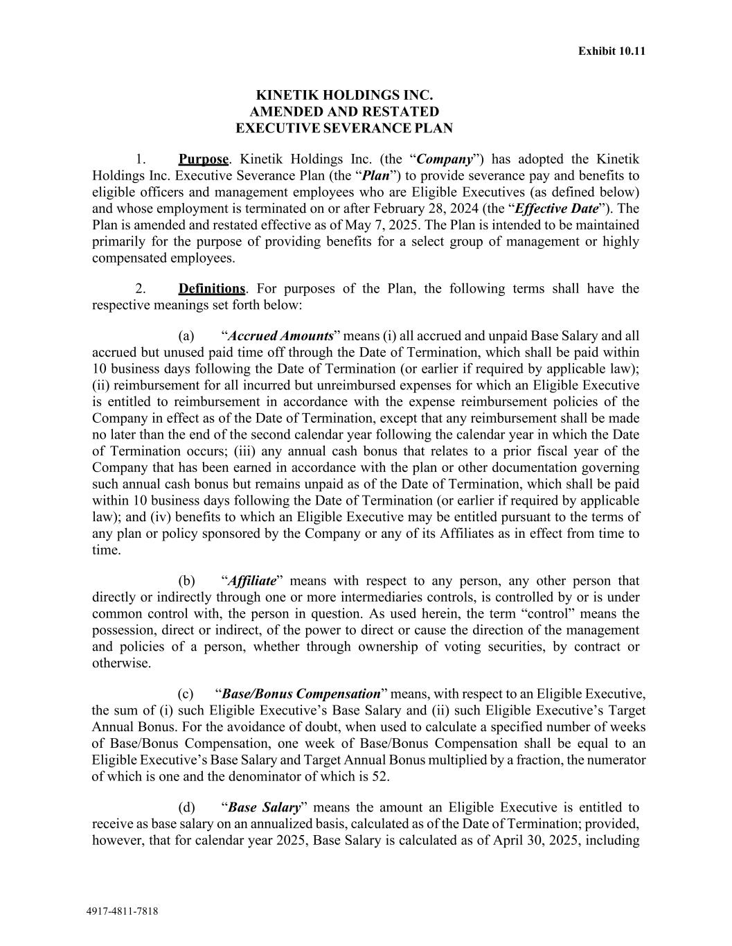 Exhibit 10.11 KINETIK HOLDINGS INC. AMENDED AND RESTATED EXECUTIVE SEVERANCE PLAN 1. Purpose. Kinetik Holdings Inc. (the “Company”) has adopted the Kinetik Holdings Inc. Executive Severance Plan (the “Plan”) to provide severance pay and benefits to eligible officers and management employees who are Eligible Executives (as defined below) and whose employment is terminated on or after February 28, 2024 (the “Effective Date”). The Plan is amended and restated effective as of May 7, 2025. The Plan is intended to be maintained primarily for the purpose of providing benefits for a select group of management or highly compensated employees. 2. Definitions. For purposes of the Plan, the following terms shall have the respective meanings set forth below: (a) “Accrued Amounts” means (i) all accrued and unpaid Base Salary and all accrued but unused paid time off through the Date of Termination, which shall be paid within 10 business days following the Date of Termination (or earlier if required by applicable law); (ii) reimbursement for all incurred but unreimbursed expenses for which an Eligible Executive is entitled to reimbursement in accordance with the expense reimbursement policies of the Company in effect as of the Date of Termination, except that any reimbursement shall be made no later than the end of the second calendar year following the calendar year in which the Date of Termination occurs; (iii) any annual cash bonus that relates to a prior fiscal year of the Company that has been earned in accordance with the plan or other documentation governing such annual cash bonus but remains unpaid as of the Date of Termination, which shall be paid within 10 business days following the Date of Termination (or earlier if required by applicable law); and (iv) benefits to which an Eligible Executive may be entitled pursuant to the terms of any plan or policy sponsored by the Company or any of its Affiliates as in effect from time to time. (b) “Affiliate” means with respect to any person, any other person that directly or indirectly through one or more intermediaries controls, is controlled by or is under common control with, the person in question. As used herein, the term “control” means the possession, direct or indirect, of the power to direct or cause the direction of the management and policies of a person, whether through ownership of voting securities, by contract or otherwise. (c) “Base/Bonus Compensation” means, with respect to an Eligible Executive, the sum of (i) such Eligible Executive’s Base Salary and (ii) such Eligible Executive’s Target Annual Bonus. For the avoidance of doubt, when used to calculate a specified number of weeks of Base/Bonus Compensation, one week of Base/Bonus Compensation shall be equal to an Eligible Executive’s Base Salary and Target Annual Bonus multiplied by a fraction, the numerator of which is one and the denominator of which is 52. (d) “Base Salary” means the amount an Eligible Executive is entitled to receive as base salary on an annualized basis, calculated as of the Date of Termination; provided, however, that for calendar year 2025, Base Salary is calculated as of April 30, 2025, including 4917-4811-7818